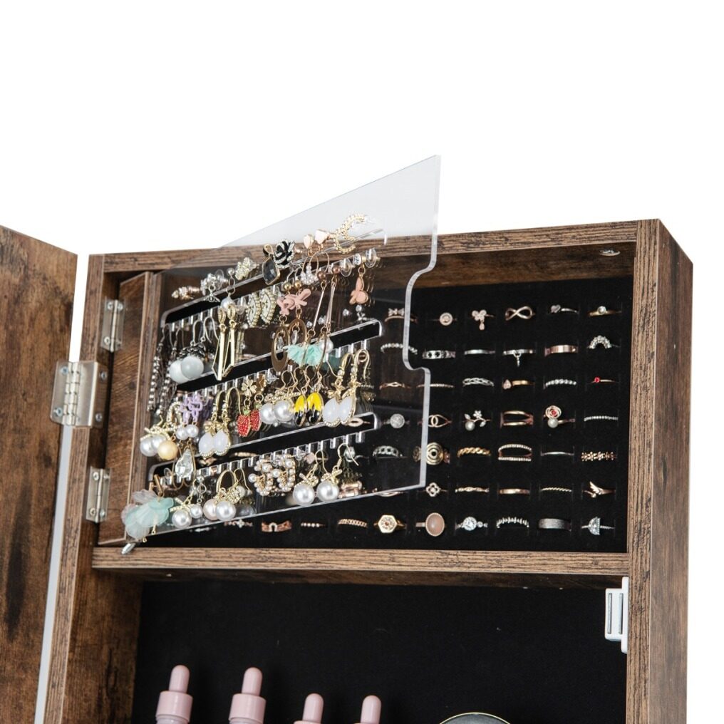 ● Worth-Mentioning Features: The earring holder frame inside the cabinet can swing out and is more convenient for you to manage the earrings. The soft lined storage space prevents scratching jewelry. And the lockable door with keys enhances security.