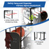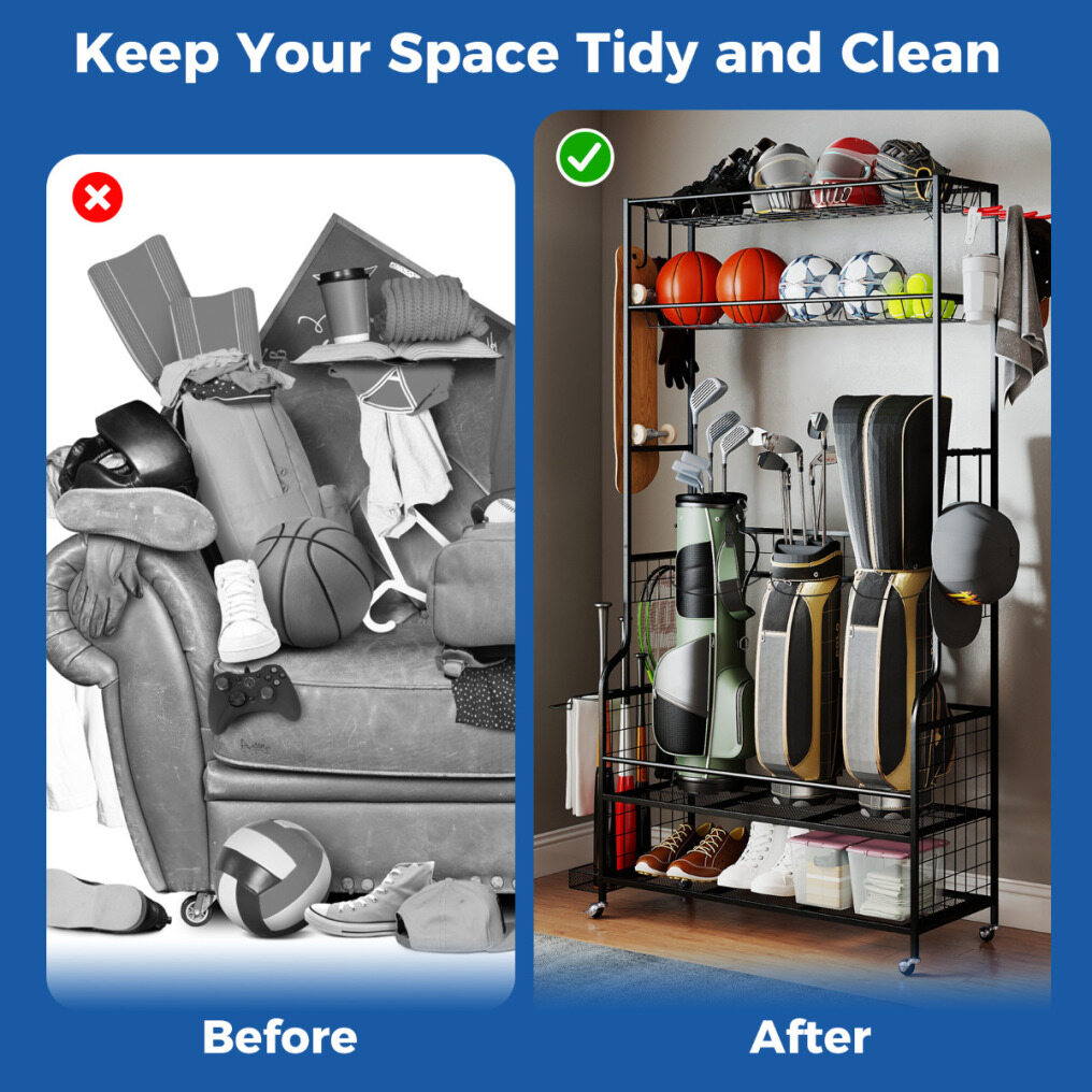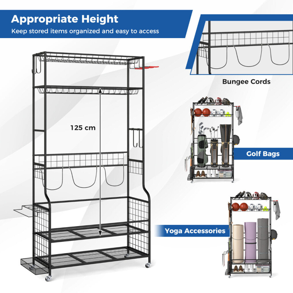 Enhanced Safety Features: For secure placement, this sports equipment organizer features thick bungee cords to prevent bags from tipping over. Additionally, the included anti-toppling device adds extra safety.