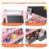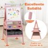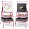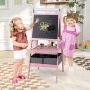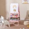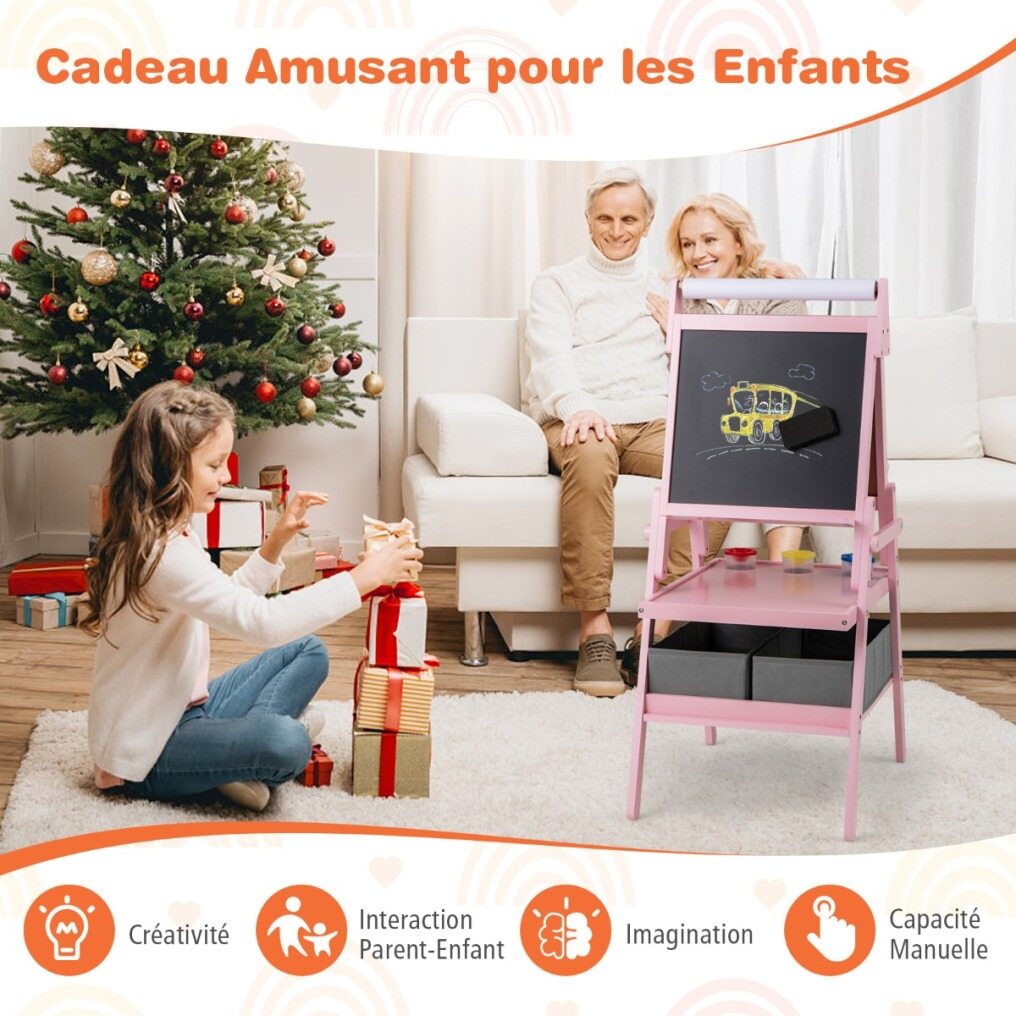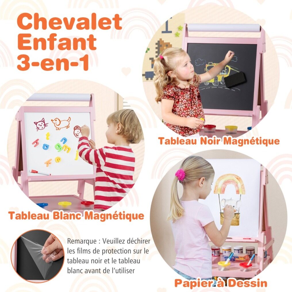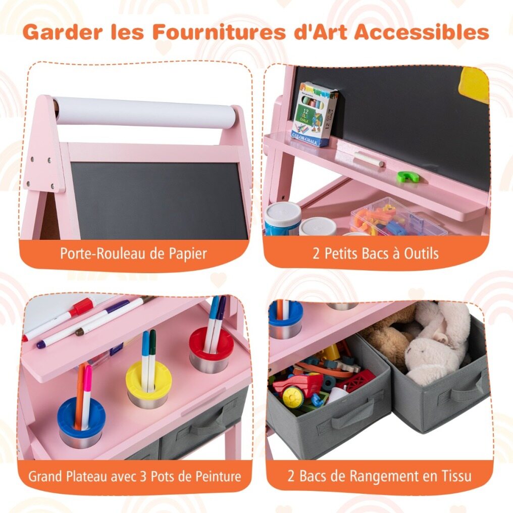 With magnetic whiteboard, magnetic chalkboard and drawing paper roll, kids can attach magnetic stickers or simply practice drawing, painting, writing and spelling. Adding to its practicality, this easel includes 2 pen trays, a storage tray, 2 fabric drawers and 3 paint cups that keep painting and drawing tools neatly organized and easily accessible. And sturdy A-shaped frame ensures it remains stable during use. Whether your child is stepping into the world of colors for the first time or refining their artistic talents, this easel is a perfect choice to light up their creative world.