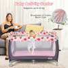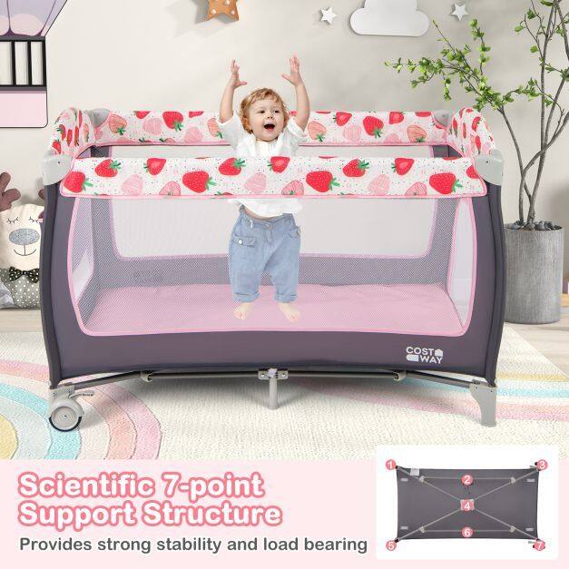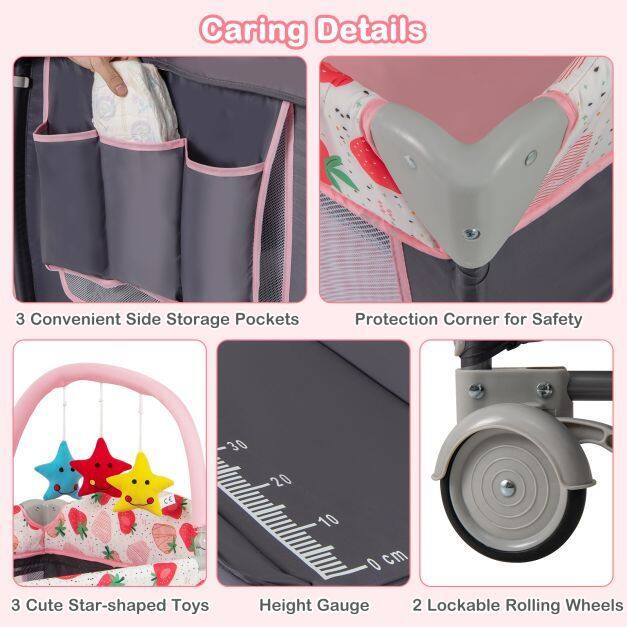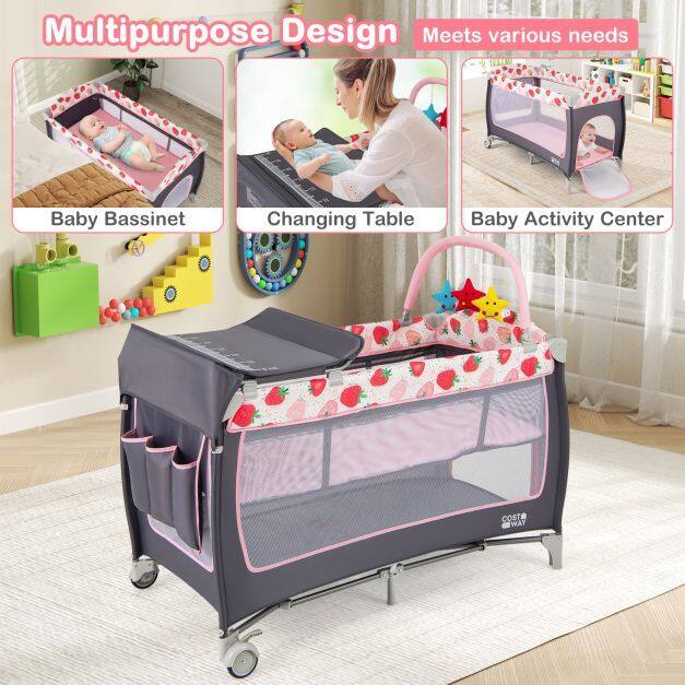 Made of solid iron pipe frame and durable oxford cloth, this baby playard ensures great stability and long-lasting use. Combining a bassinet bed, diaper table and activity center, our baby playard can be used in various ways and can accompany the growth of your baby. The diaper table can help parents change diapers easily without bending over. And the soft mattress offers a comfortable space for babies to rest or sleep. The breathable mesh netting is high enough to keep the baby in place and ensures great visibility for parents to observe the baby at any time. The zippered side door offers baby easy access to the playpen. 3 cute toys can bring a lot of amusement to the baby while making them fall asleep quickly. There are 2 casters with brakes equipped for easy moving and relocation, and all corners are covered to protect babies. The folding design makes the playpen easy to store and carry. You can take it anywhere with the carrying bag.