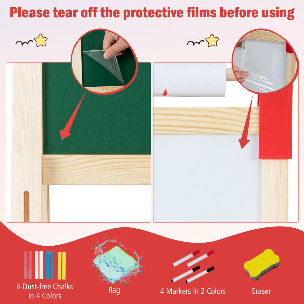 ● 3-in-1 Wooden Kid's Easel: The kid's art easel features 1 magnetic chalkboard and 1 magnetic whiteboard for kids to draw and create. Tips: Please tear off the protective film before use. Besides, the 16.4'(L) x 12"(W) paper roll offers more writing or drawing space for your little painter.