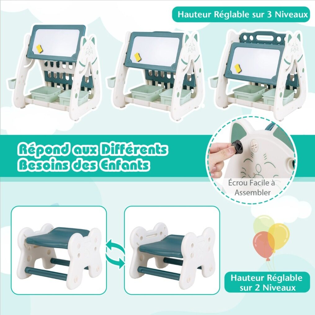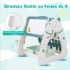 Composed of a book rack, dry-eraser board and a writing desktop, this 3-in-1 art easel satisfies kid's needs for reading, painting and writing. 4 colorful markers and 1 magnetic eraser are provided for little artists. Besides, the 4-tier book rack, 2 storage baskets and a pen container keep kid's books and art supplies well-organized. Mom will never worry about the messy kid's room. What's more, the kid's art easel and stool set with ASTM and CPSIA certification is crafted from child-friendly PE material, which is burr-free and odorless for kids' safety concerns. The A-shaped construction and anti-slip silica foot pads make the standing easel more stable. Children can sit comfortably on the stool to enjoy hours of fun. And the seat height can be adjusted from 7.5" to 9.5", as kids grow up. This double-sided standing easel is sized right for children aged 1-5 years, a great gift idea on many festivals.