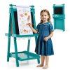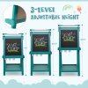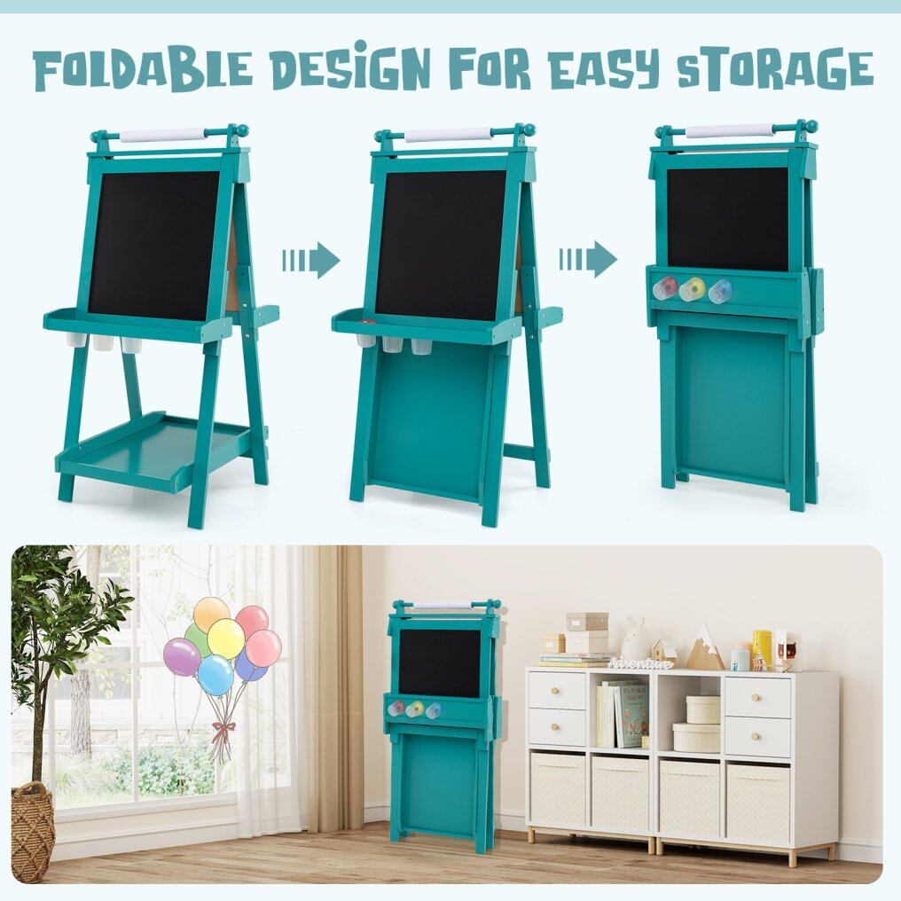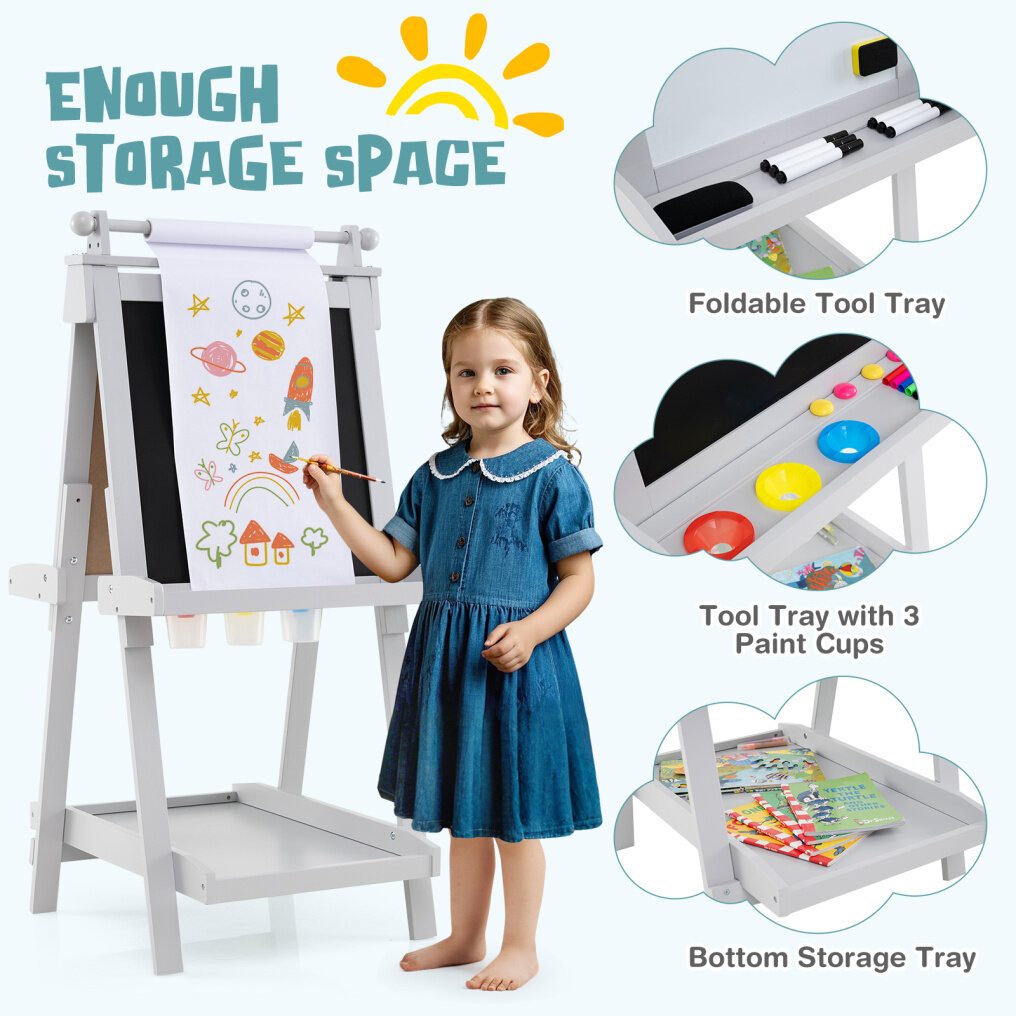 This double-sided easel has a practical chalkboard and magnetic whiteboard, as well as a replaceable paper roll, providing endless drawing possibilities. Kids can store their art tools on 2 tool trays and 1 large tray while drawing. 3 paint cups help kids organize their paintbrushes. With 3-level adjustable height, the easel will grow with your child. Designed with kid’s safety in mind, the easel features smooth rounded corners and edges to avoid injuries. Additionally, the versatile easel is also easy to fold for space-saving storage or convenient transport. Let your child's imagination soar with our interactive easel.