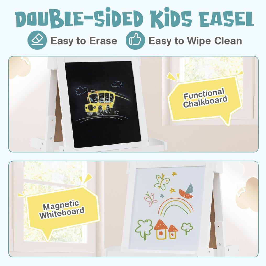 Double-sided Kids Easel: The kids easel comes with a functional chalkboard and a magnetic whiteboard for kids to draw, enabling your little artist to unleash their creativity. The included paper roll is ideal for different painting supplies, such as markers, paintbrushes, and finger paints. The paper roll measures 5 m x 30 cm(L x W).