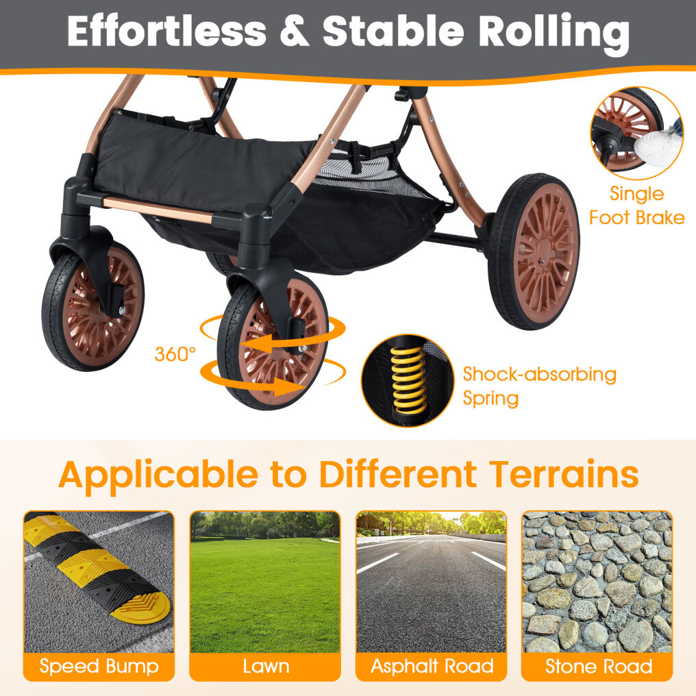 ● Flexible and Effortless Rolling: Equipped with 360° swivel wheels and shock-absorbing springs, the pet travel cart glides effortlessly over different surfaces. Rear wheels are fitted with safety brake for reliable stopping. In addition, the ergonomic handle delivers a comfortable hold for smooth pushing.