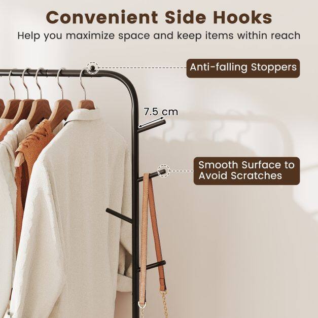 Thoughtful Details: The wardrobe rack includes anti-falling stoppers on the ends of the rod to prevent clothes from slipping off. Additionally, the smooth surface finish on all hooks protects your garments from scratches.