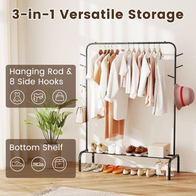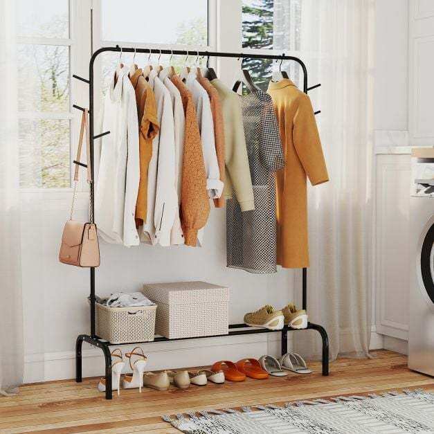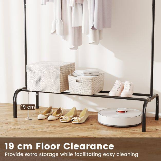 Spacious Hanging & Storage: This clothes rack features a sturdy single hanging rod combined with a bottom shelf that provides a 20 cm floor clearance. These storage spaces allow ample space for shirts, jackets, shoes and boxes.