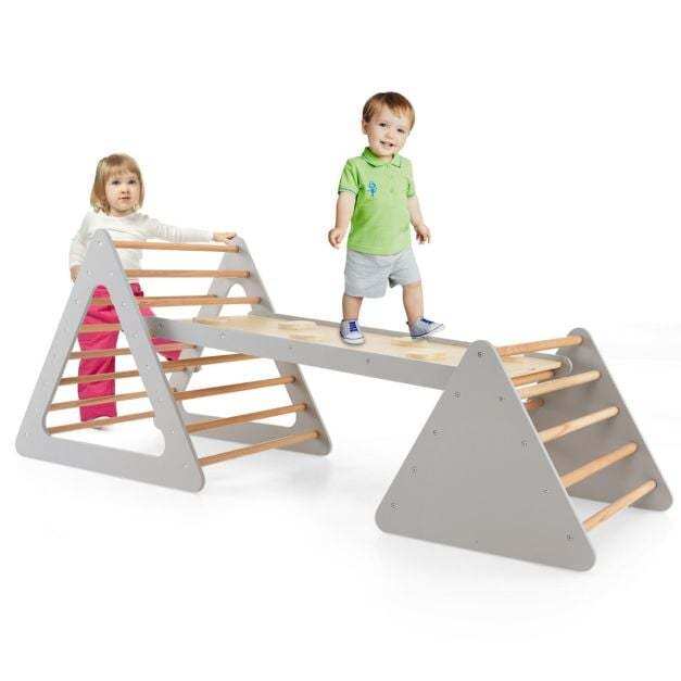 <p>Our 3 in 1 climbing set will give children endless fun and promote their motor skills, balance and courage!<br />It includes 1 large triangular ladder, 1 small triangular ladder and 1 ramp. This is double-sided and has a structured side for climbing, and a smooth side for sliding. The 3 parts can be used in different combinations as required. Made of natural wood and thanks to the stable structure, the parts are very stable and durable. In addition, injuries are avoided thanks to the rounded edges and the safe color. The small Ladder can be placed under the large one to save space.</p>