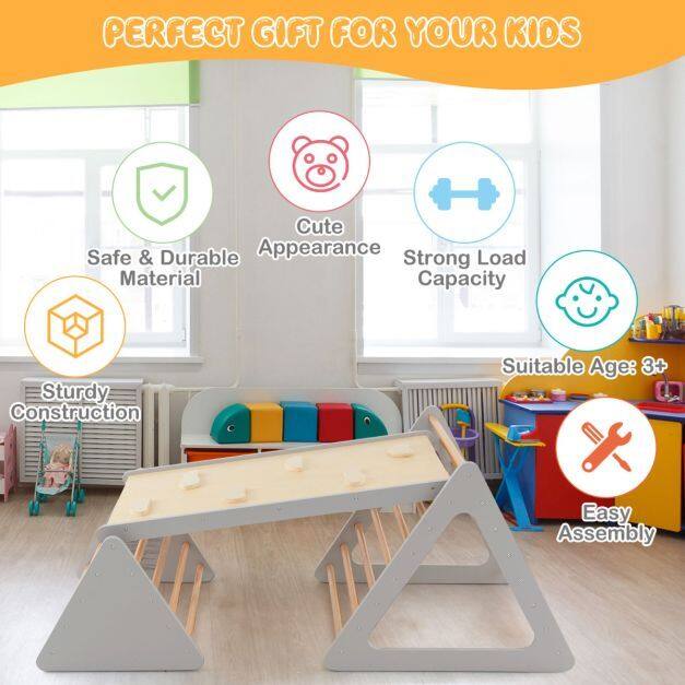 3 in 1 climbing set: This climbing set contains 2 different sized triangular ladders and 1 ramp for climbing and sliding, which promotes balance, motor skills and courage, as well as meets various needs.