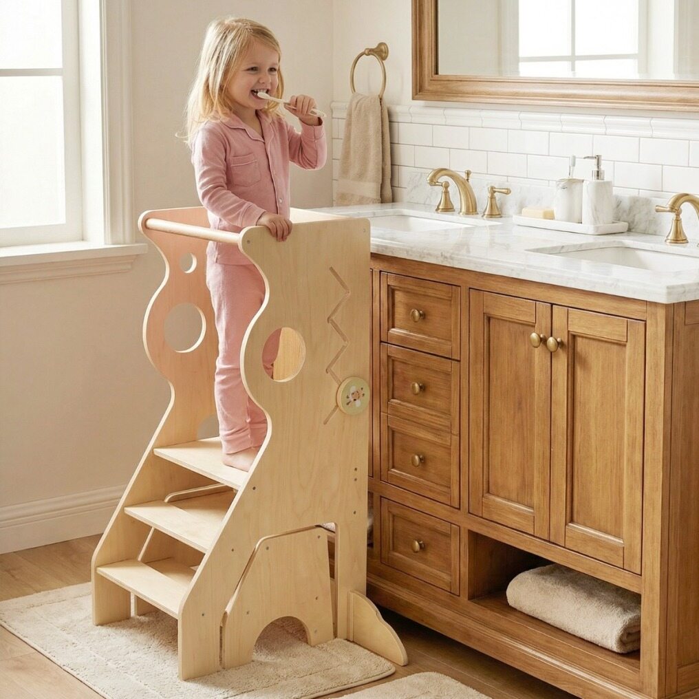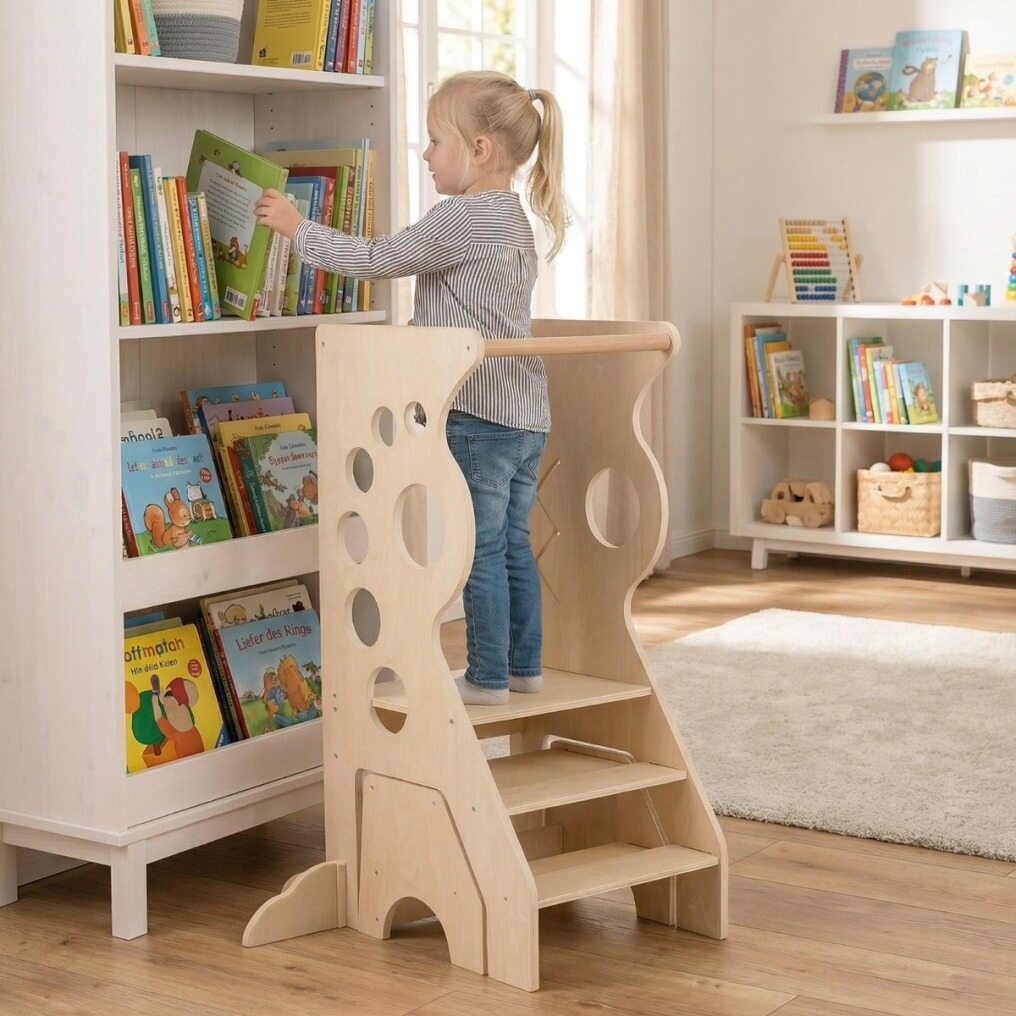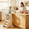【Enhanced Stability and Safety】Designed with a sturdy plywood frame and reinforced anti-tip feet, this kitchen step stool offers added peace of mind when your child is using it. Safety is further enhanced by the smooth, rounded edges and removable safety bars.