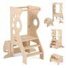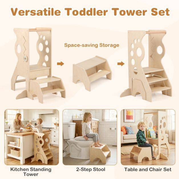 This toddler tower combines versatility, safety, and playful design in a compact solution. Including a two-step stool, it easily converts from a kitchen learning tower to a children's table and chair set to meet your child's evolving needs. Designed to provide counter-height independence, this tower supports your child's involvement in cooking, handwashing, and other daily activities in various spaces such as the kitchen, bathroom, or playroom. Featuring an integrated line-following game, it offers endless fun while promoting your child's development. Made of sturdy plywood with reinforced anti-tip feet, this kitchen step stool ensures added stability and safety during use.