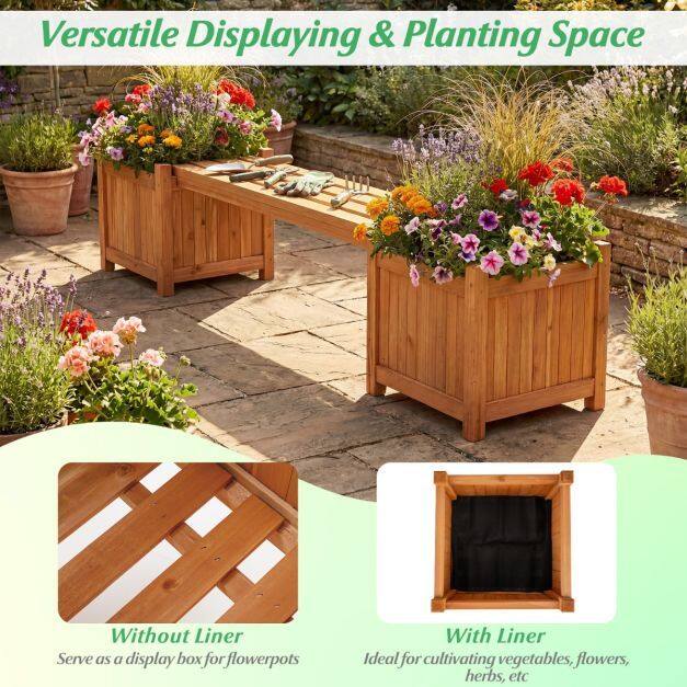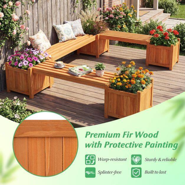Stable and reliable construction: Made from high-quality solid wood, this planter and bench set offers a robust structure that withstands the elements. Finished with a waterproof teak oil treatment, it guarantees durability and resilience.
