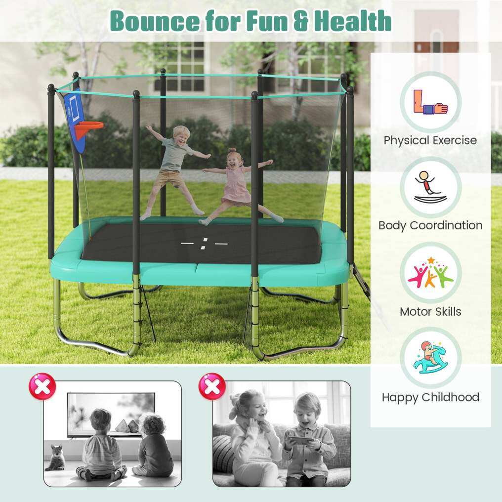 Versatile trampoline set: This trampoline includes a basketball hoop and soccer goal, enhancing the fun in your backyard. Suitable for kids, teens, and adults, it allows the whole family to participate in a variety of activities.