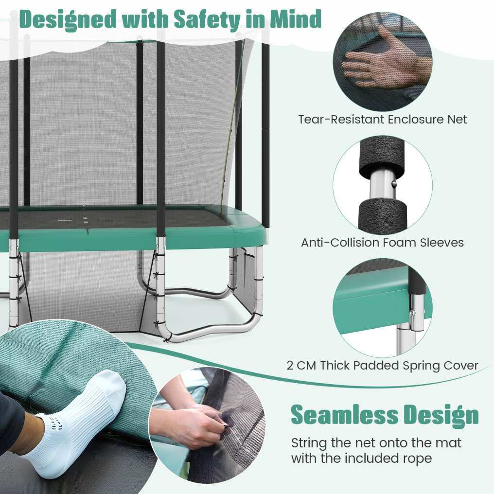 Designed with safety in mind: This kids' trampoline features a seamless design that allows you to attach the net to the mat with the included rope. Additionally, a tear-resistant safety net, anti-collision foam covers, and thickly padded spring covers ensure increased safety.