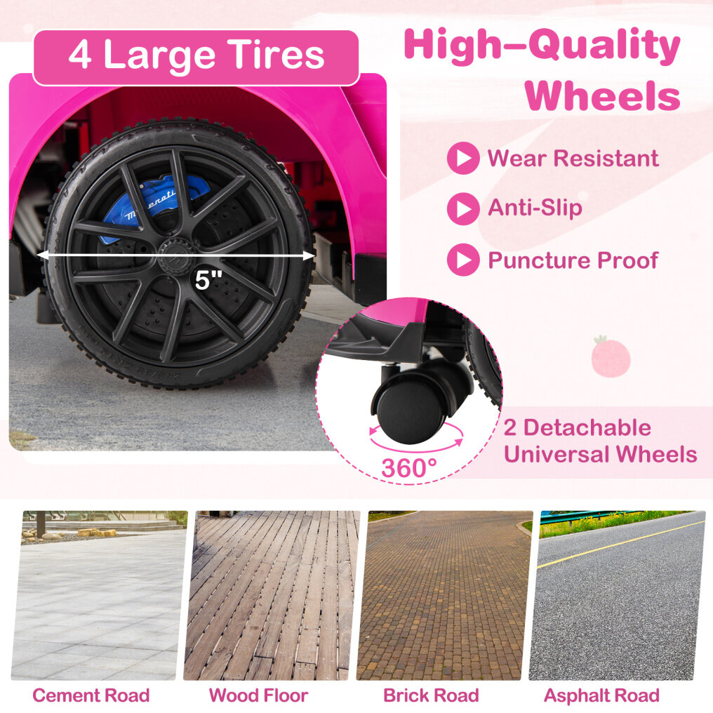 Flexible and Safe Riding: This adorable ride on car features a protective guardrail and handlebar, ensuring a secure grip and a smooth ride. 4 large tires which are wear resistant, anti-slip and puncture proof ensure bump-free ride on different terrains. Moreover, the anti-roll baffle on the back adds higher safety.