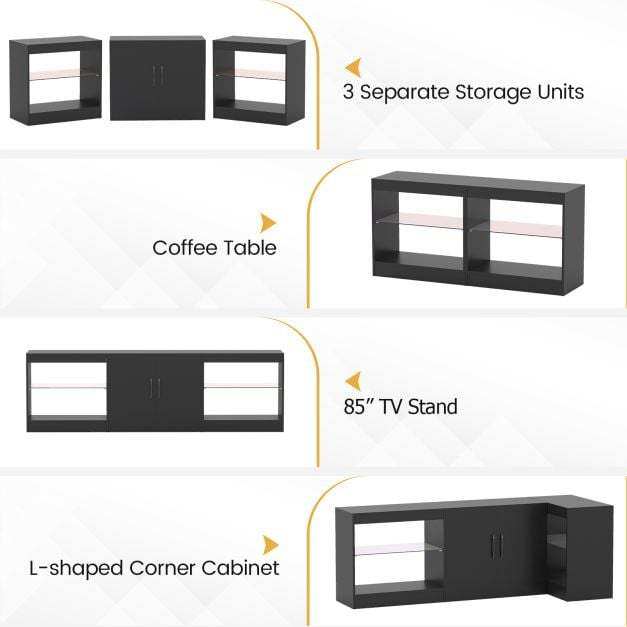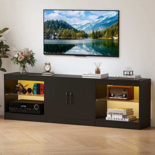 【King-Size Capacity】This entertainment center supports TVs up to 85" on its extra-large surface, while two 5-position adjustable shelves and a central cabinet accommodate consoles, soundbars, and game libraries. Store cables, remotes, and collectibles behind closed doors for a neat and tidy space.