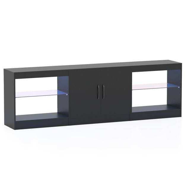 This incredibly versatile modular TV unit adapts perfectly to your space while dazzling with its remote-controlled LED lights, offering 16 vibrant colors and 4 dynamic modes. Ideal for creating ambiance for movie nights or adding a pop of color to your interior. It accommodates TVs up to 85" and organizes all your equipment with 2 adjustable shelves and a spacious central cabinet. Crafted with sumptuous tempered glass and soft-close hinges, this entertainment center combines luxury and functionality. Its modern rustic style with a grained wood finish ensures seamless integration into any space, adding a touch of elegance to your home.