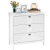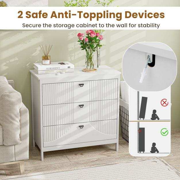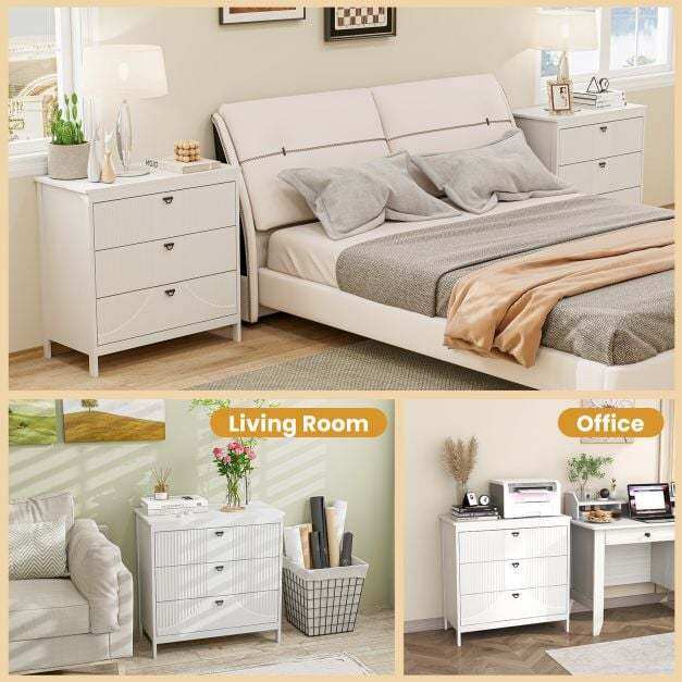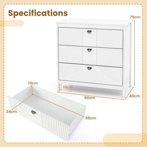 This 3-drawer dresser with great workmanship offers a perfect solution to declutter and enhance efficiency. Featuring three convenient pull-out drawers and a generous top surface, this storage cabinet provides ample space for organizing essentials while reducing mess. The thickened MDF and sturdy legs ensure lasting durability and can support up to 60 kg, guaranteeing a stable structure. Each drawer boasts high-quality metal slides for seamless operation, complemented by elegant handles that add a touch of sophistication to the design. Non-slip foot pads protect floors from scratches and add stability. With water-proof and smooth surfaces, maintenance is a breeze, offering a convenient and long-lasting furniture solution. Versatile and adaptable, this 3-drawer dresser seamlessly transitions from a sofa side table to a stylish office cabinet, catering to various needs.