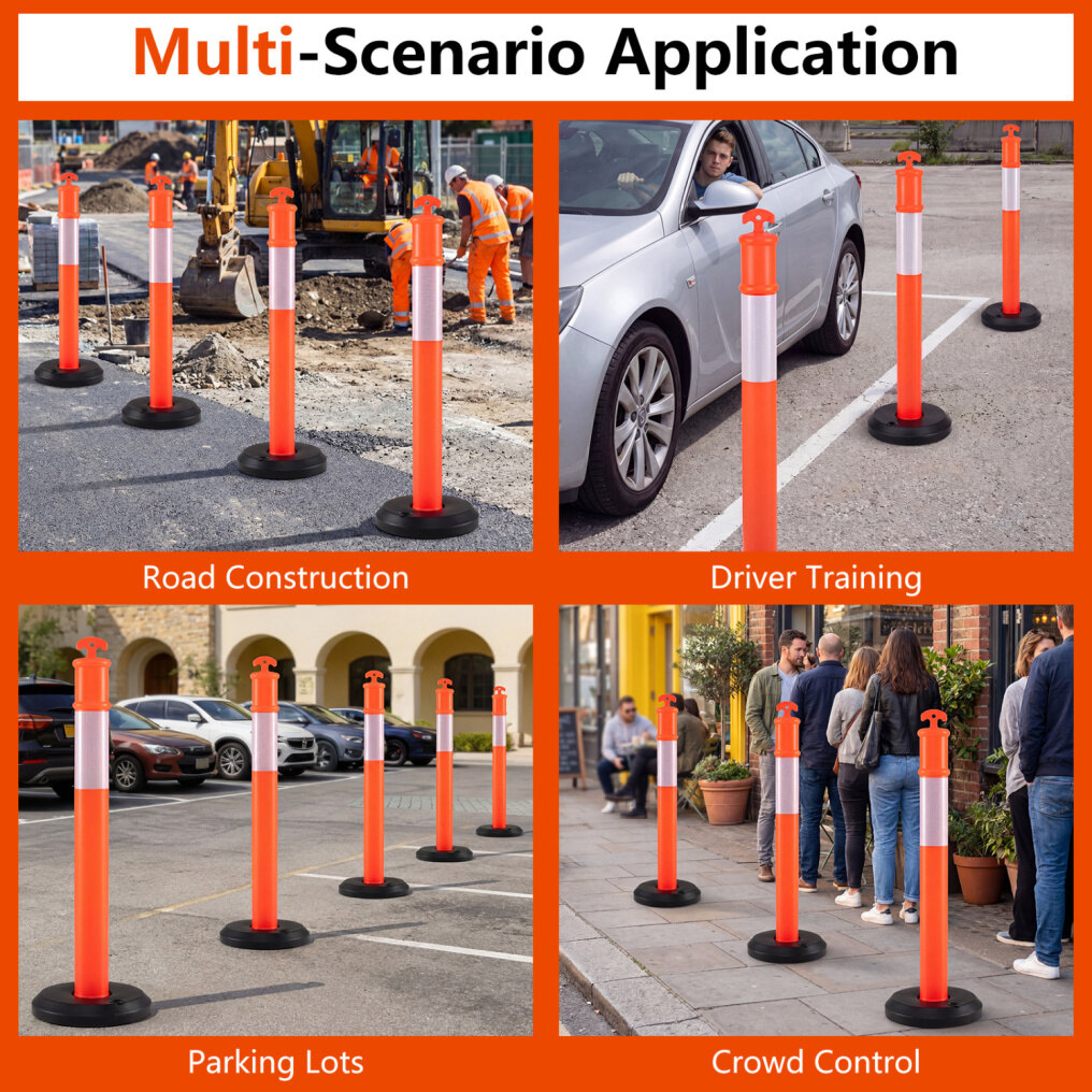 ● Multi-Scenario Application: A small opening at the top allows each traffic delineator post to work with chains or warning tape for more flexible space control. From road construction and parking lots to driver training and crowd control, these posts help define boundaries clearly and efficiently.