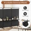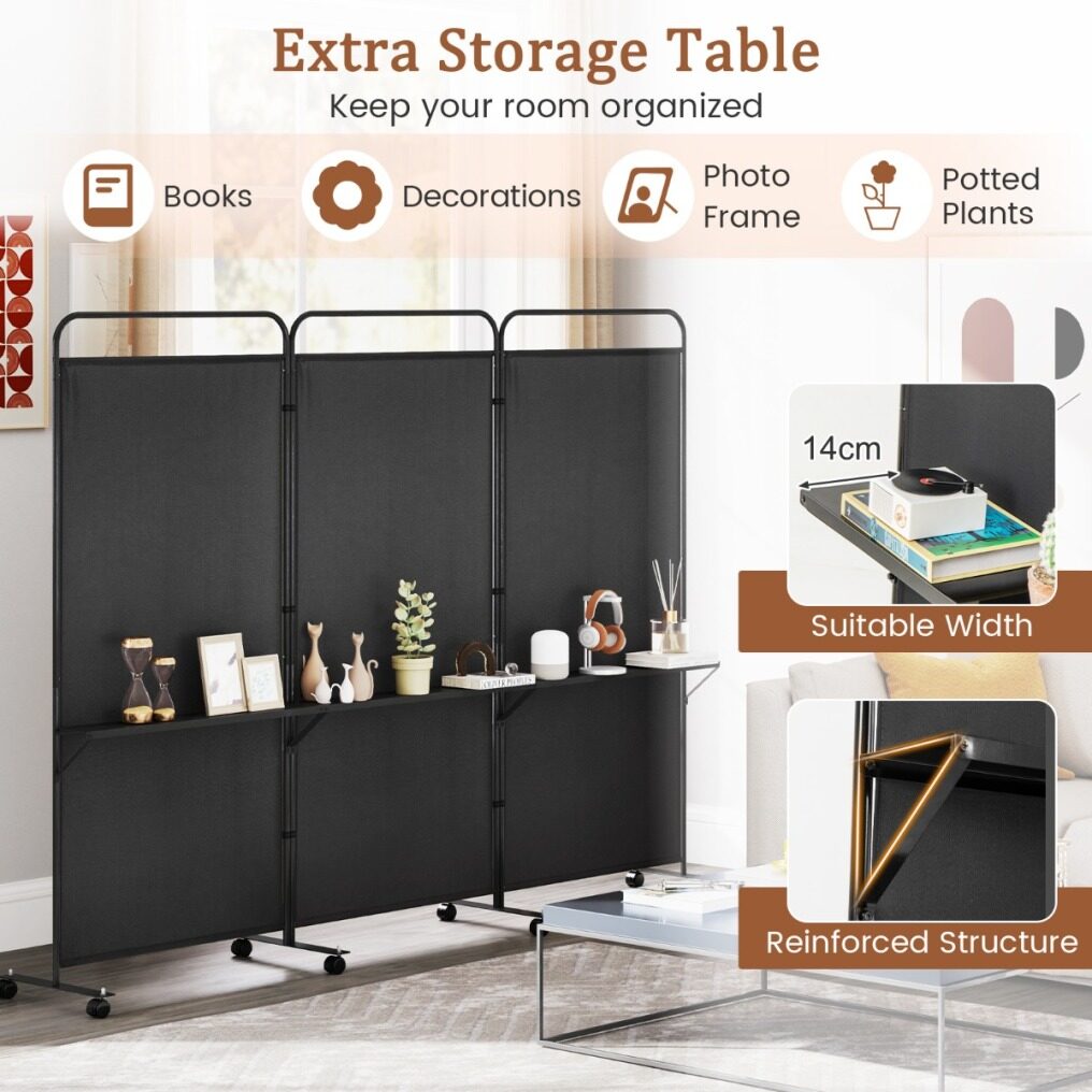 Featuring 3 metal shelves, this folding room divider is an efficient solution for instant privacy and organization. Covered with a finely chosen polyester fabric, the room partition adds a gentle touch while ensuring coverage and ease of maintenance. Besides, the privacy screen is made of powder-coated metal frame for long-lasting use. Designed with lockable wheels, this wall divider ensures secure placement and easy movement. Effortlessly adjust your living space with its flexible swivel buckles to create areas for privacy or solitude.