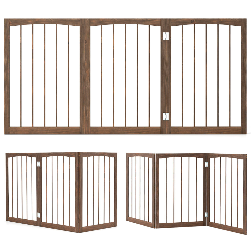 Our freestanding pet gate includes 3 flexible panels that allow for easy customization in various shapes and expansions, adapting to different room sizes and layouts effortlessly. It can be set in I, U, or Z formations to suit doorways, hallways, or any areas where you need to contain or protect your pets.