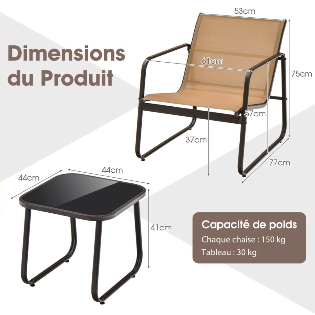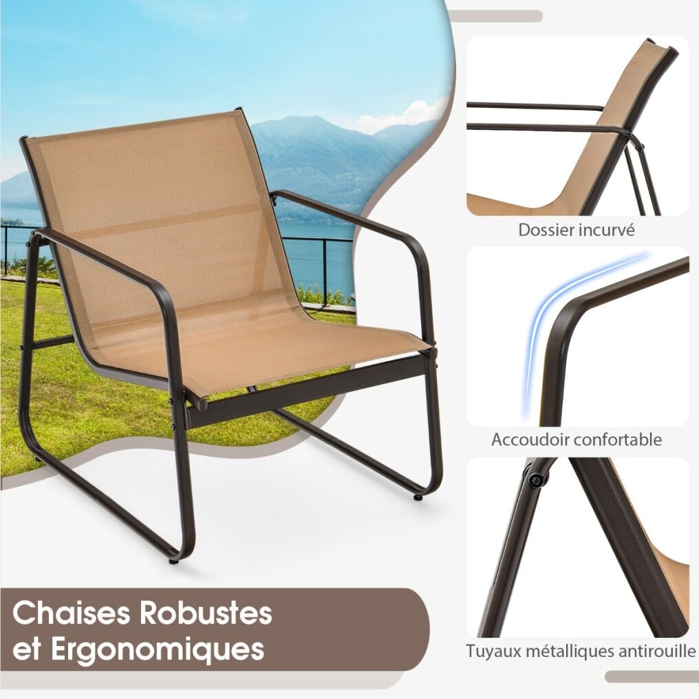 The ergonomic seat with breathable fabric allows you to sit with more comfort and less heat. And the sturdy metal frame ensures that the chairs are stable enough. The adjustable foot pads also effectively prevent tipping for added stability. In addition, the compact yet functional coffee table allows you to easily take drinks or snacks. And its tempered glass tabletop is quite easy to maintain. This 3-piece patio furniture set will be a beautiful addition to your garden, poolside, etc.