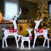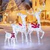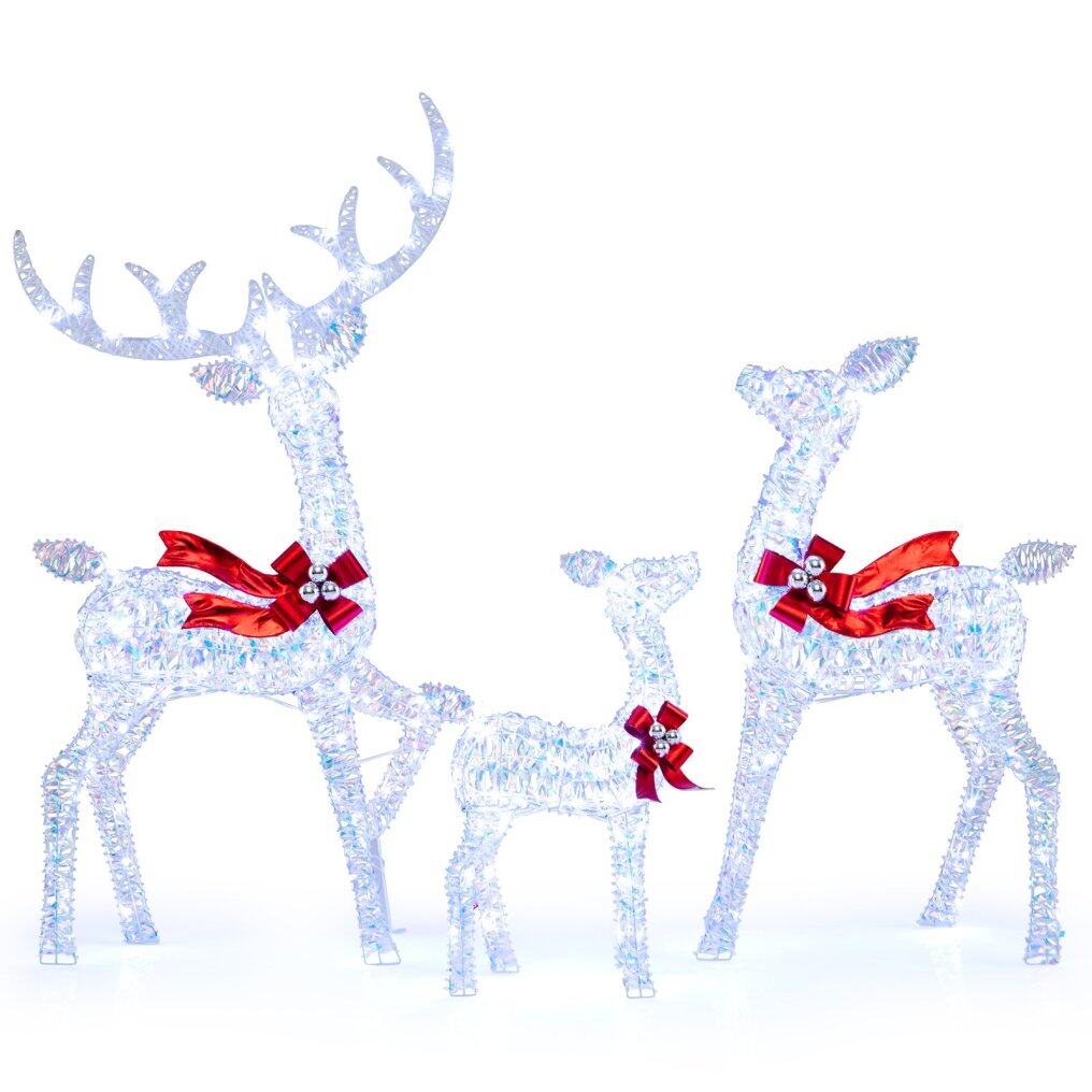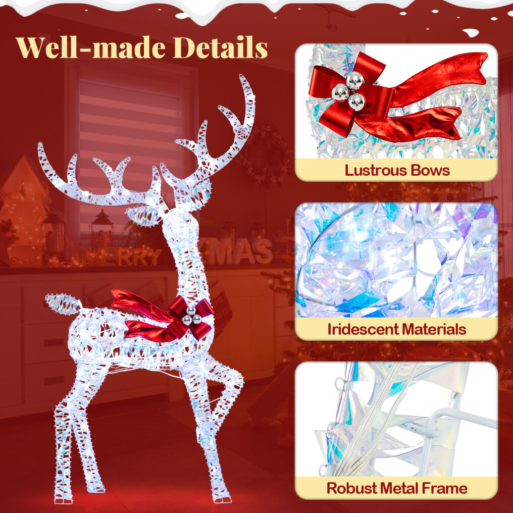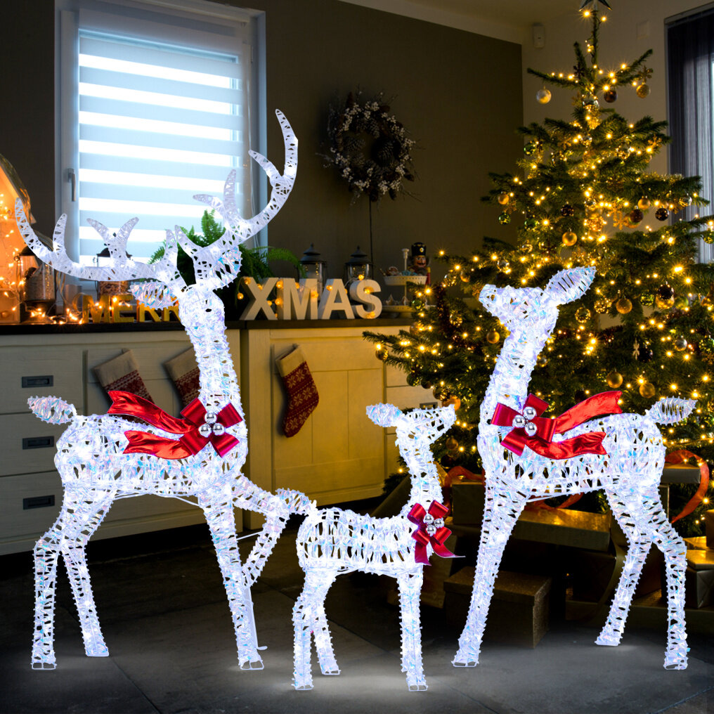 ● 3 Pcs Reindeer Family: Enhance your holiday display with this charming set of 3 lighted reindeer, featuring a buck, a doe, and a fawn. Each deer is accented with lustrous red bows and crafted from iridescent materials, catching and reflecting light beautifully for a magical shimmer.