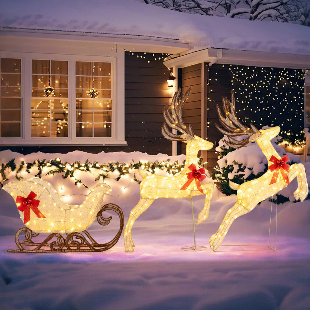 ● 3-Pcs Reindeer & Sleigh Set: This 3-piece Christmas decoration set includes 2 graceful reindeer and a classic sleigh. Featuring a lively design with delicate red bow decorations, this set offers endless setup possibilities, instantly creating a serene and joyful holiday scene.