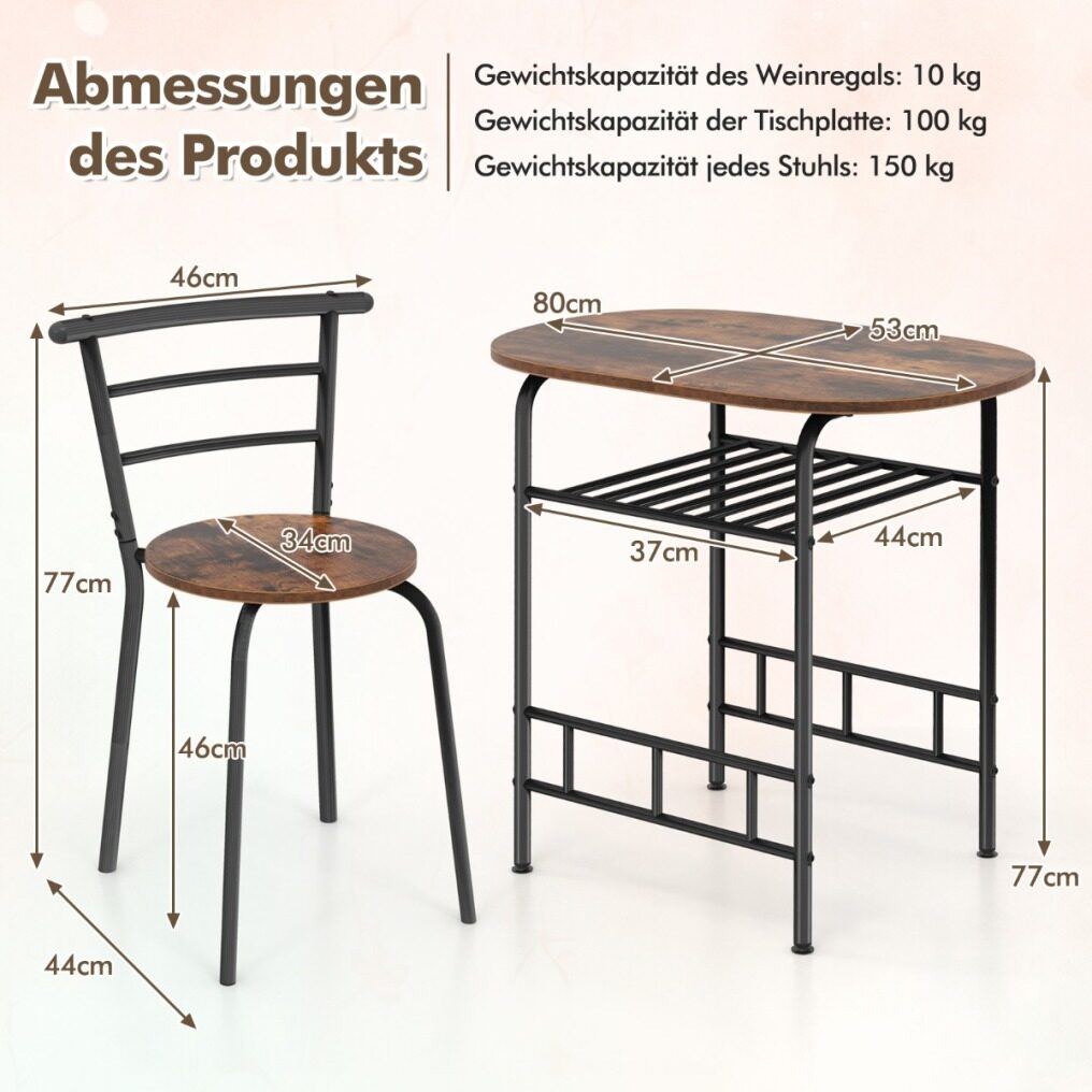 The kitchen set contains 1 practical table and 2 chairs for 2 people to enjoy intimate meals. The wide tabletop and additional wine rack provide abundant storage space for food, drinks, dishes, and more. Moreover, the ergonomic chairs have curved backrests and smooth seats to ensure ultimate comfort. When not in use, the 2 chairs can be tucked under the table. Made with MDF panels and metal pipes, this dining room set is durable and strong enough to offer a long-lasting service life. The tabletop supports up to 100 kg, while each dining chair holds up to 150 kg. Additionally, the dining set also features reinforced metal structure and adjustable foot pads to improve overall stability.
