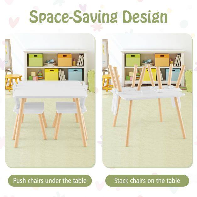 ● Practical and Space-saving Set: The table is 24.5" x 24.5" x 17"(L x W x H), while each chair measures 13" x 12" x 18.5"(L x W x H). You can place them in the kid's room, play room or daycare. Besides, thanks to its space-saving design, you can push chairs under the table or stack chairs on the table when not in use.