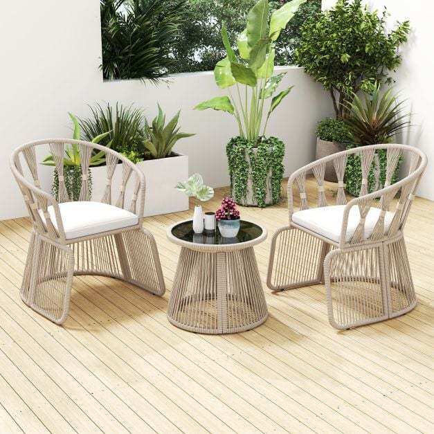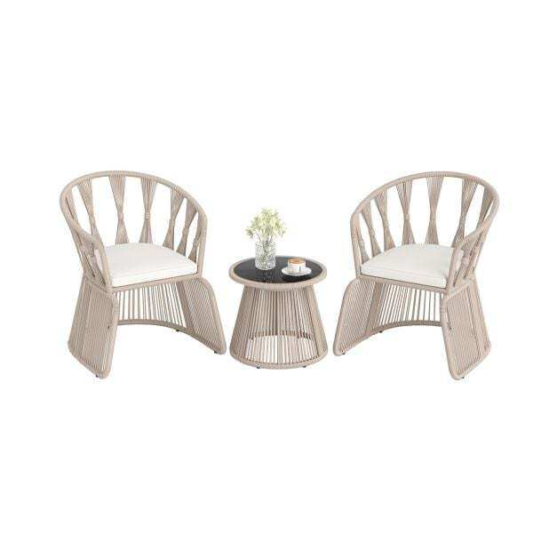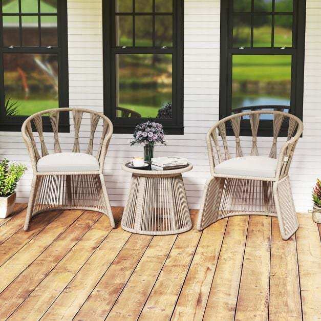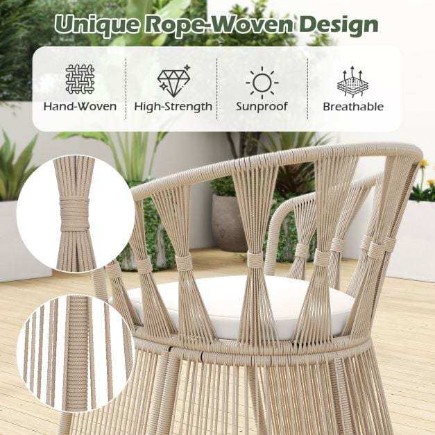 ● Unique Rope-Woven Design: Enjoy unparalleled beauty with this hand-woven rope-crafted patio chair set. The high-strength, sunproof, and breathable rope ensures durability and comfort, making it a perfect addition to your outdoor space.