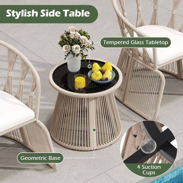● Stylish Side Table: Complementing the chairs, this patio furniture set includes a chic side table with a geometrical base. The tempered glass tabletop is held securely by 4 suction cups, which is not only stylish but also easy to clean and maintain.