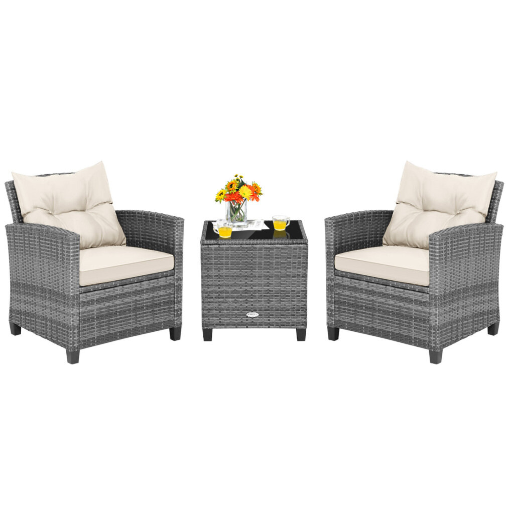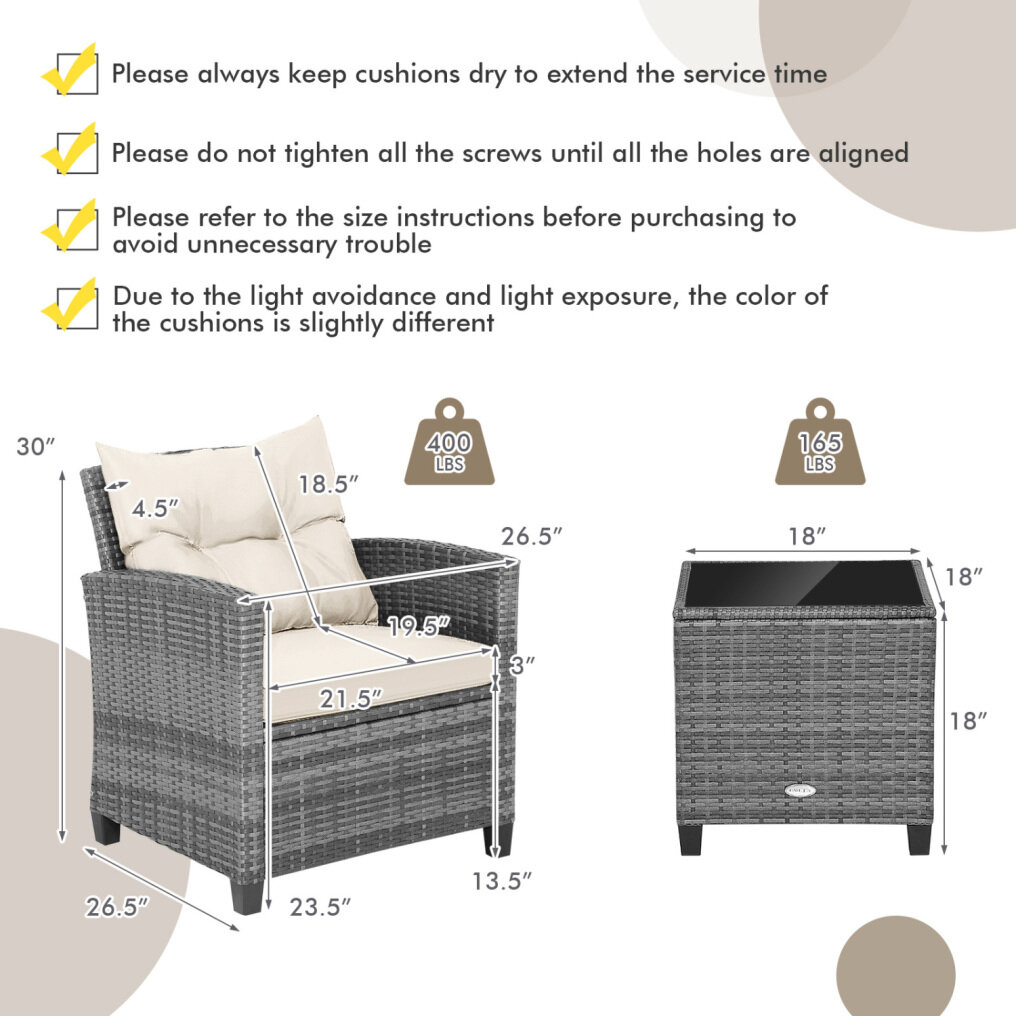 Multi-Scene Applicable: Designed with simple style and elegant rattan, this 3-piece patio set fits well for different occasions, such as poolside, backyard, garden, balcony and so on. It will create the perfect place for you to spend pleasing outdoor leisure time with the one you love.
