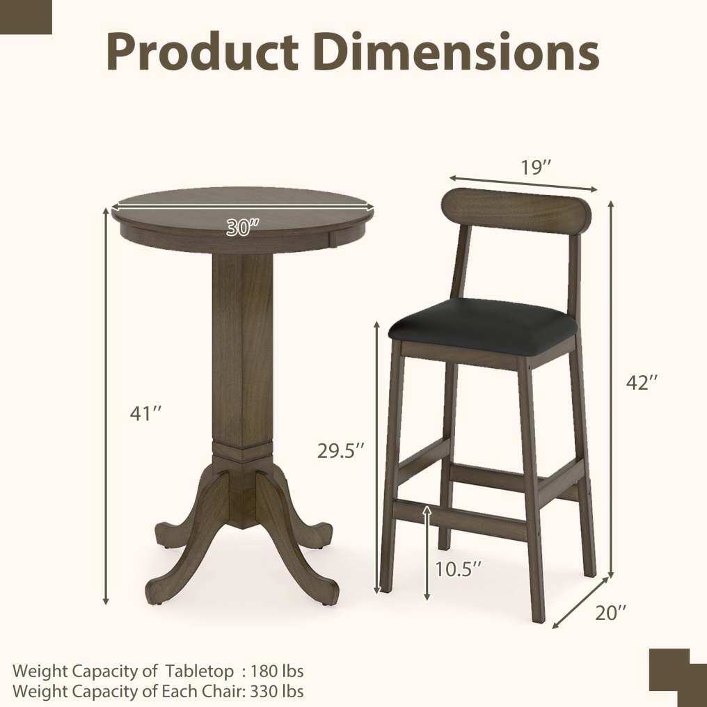 ● Bistro Set for 2: The 3 piece bar table set comes complete with a roomy 30" round pub table and 2 armless stools with size of 19" x 20" x 42" (L x W x H ), creating the perfect arrangement for cozy dining, coffee chats, or sophisticated entertaining.