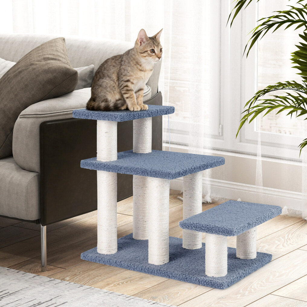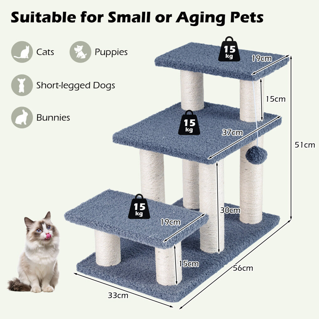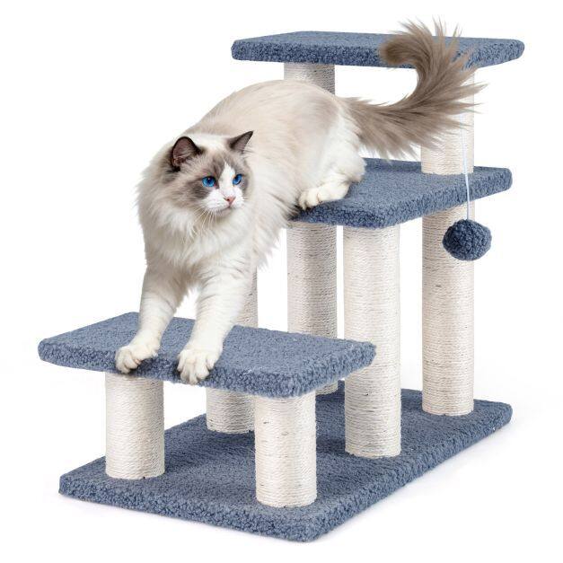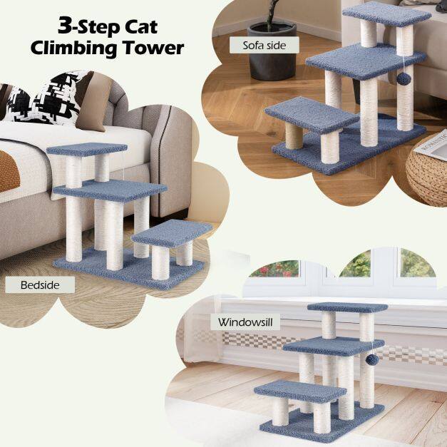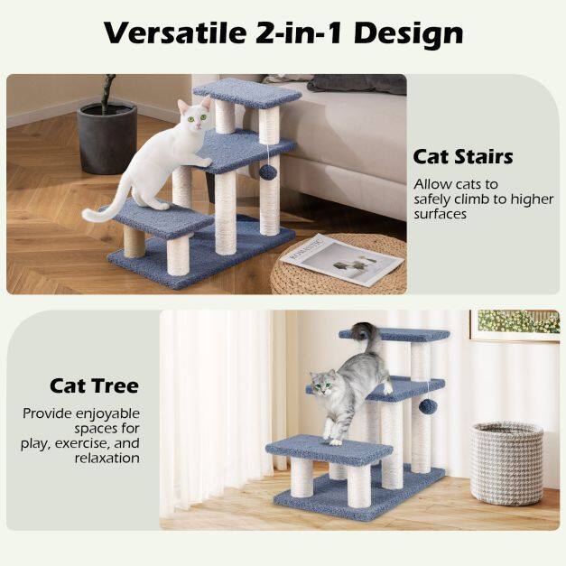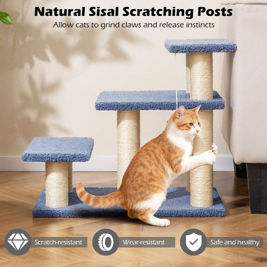 ● Built-in Play Features: The cat stairs come equipped with natural sisal scratching posts to satisfy cats' scratching instincts and help protect your furniture. The enticing plush dangling ball adds excitement and encourages playful batting.