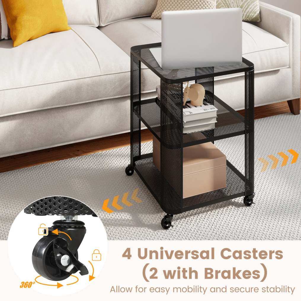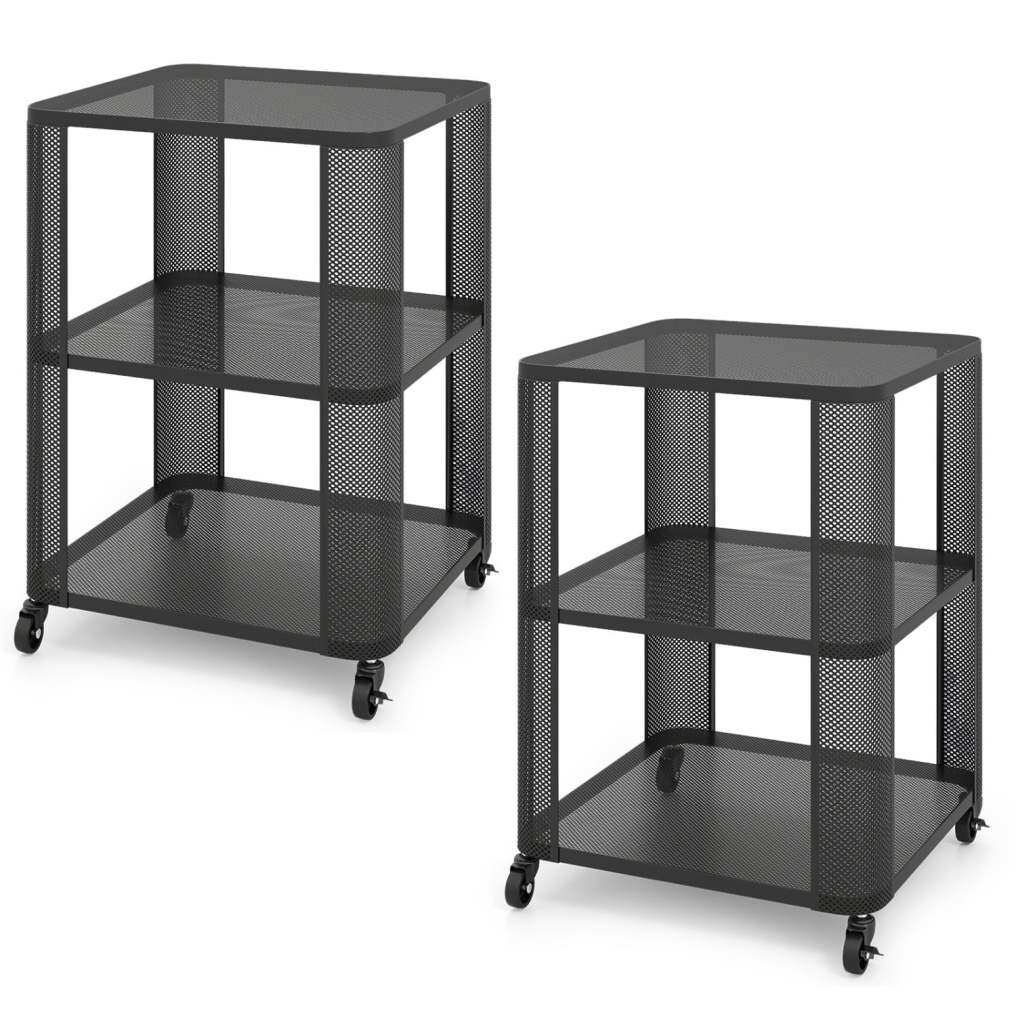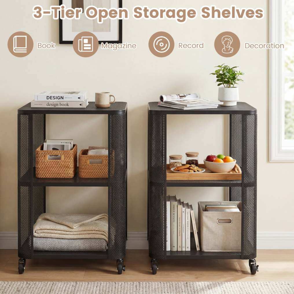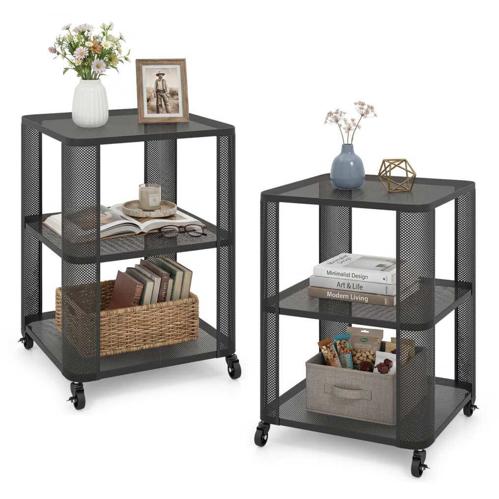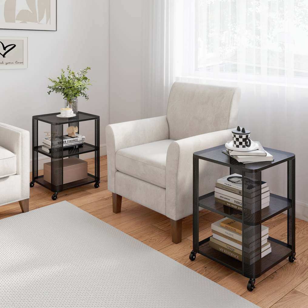 3-Tier End Table with Wheels Rolling Side Table with Open Storage Shelves-Set of 2