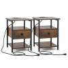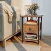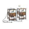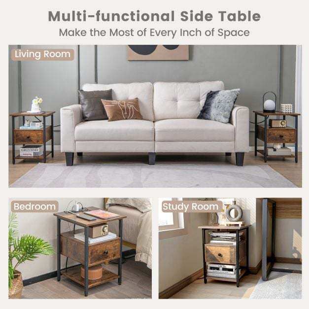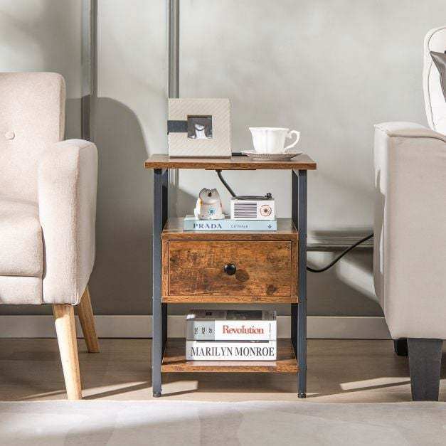 This industrial style nightstand not only has 2 open shelves, but also a pull-out drawer with handles. The spacious tabletop of the nightstand can accommodate a remote control, lamp or small potted plant. What's more, this self-contained storage unit is also a convenient charging station. 2 AC outlets, 1 Type-C and 1 USB ports can be used to charge all your electronic devices, whether it's a phone, tablet or lamp. Moreover, 140 cm of power cord ensures that you can connect it to a power source. In addition, the adjustable foot pads not only protect the floor, but also keep the small side table balanced at all times. Not only for the bedroom, but also for the living room or study! This sleek looking multifunctional side table will undoubtedly bring a stylish industrial charm to your home.