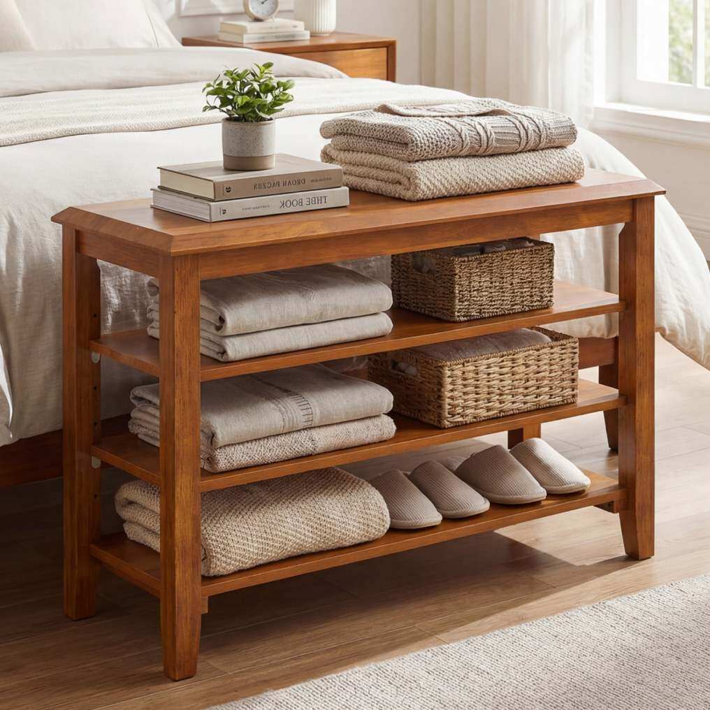 ● Versatile Application: Beyond a simple shoe rack, it serves as a comfortable shoe rack bench in entryways, a compact storage shelf in living areas, or a handy bedside bench. Its clean, natural wood finish blends effortlessly into diverse home settings.
