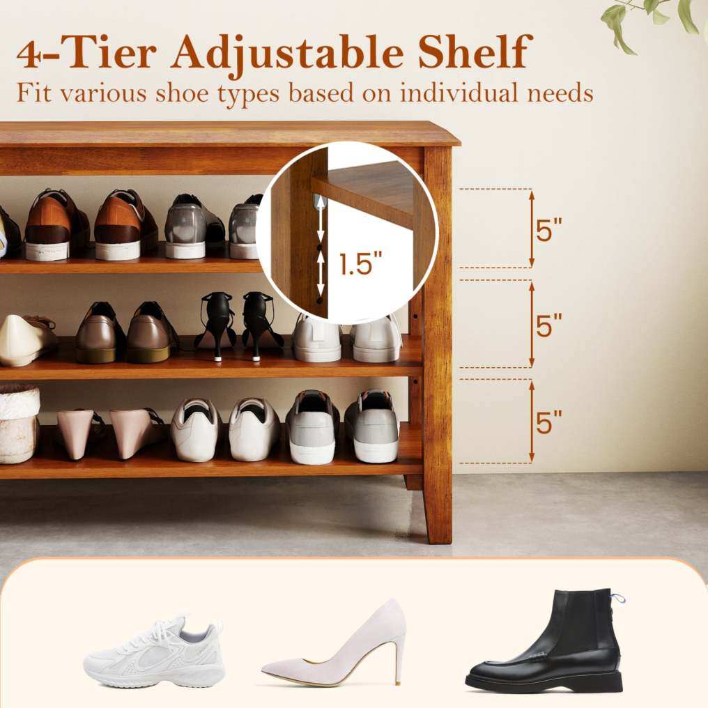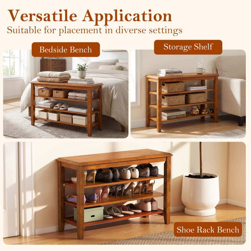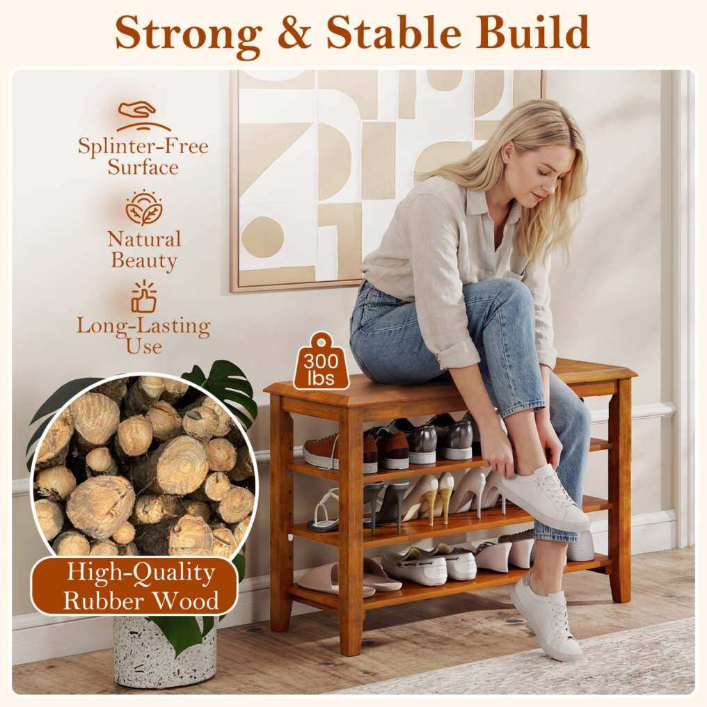 ● Strong & Stable Build: Built with thickened high-quality rubber wood, this shoe bench offers a sturdy and reliable build, supporting up to x kg on the top seat. The splinter-free surface ensures safety, , making it suitable for long-lasting use.