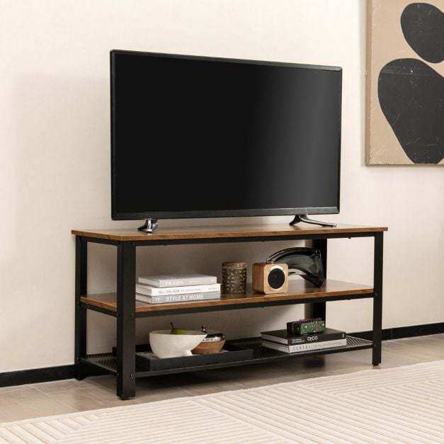 Heavy-Duty Metal Frame: This TV console table is made of sturdy engineered wood and strong metal frame, which can support up to 60kg on the top and the second shelf, and 30kg on the bottom shelf. The adjustable foot pads provide you with floor protection and high stability when using.
