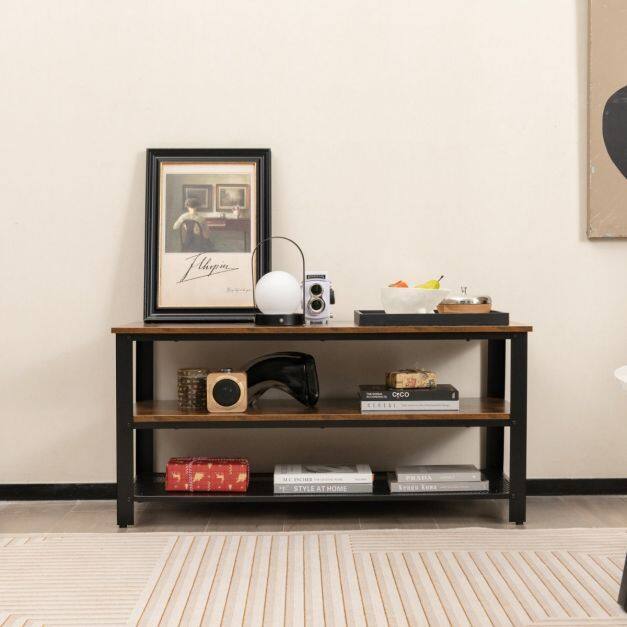 3-tier open storage shelf creates ample storage space for your DVD, speaker, remote control, cups, laptops, snacks, books, decorations and more. The adjustable foot pads bring great stability and protect the floor from scratches. The waterproof finish makes cleaning effortless. Designed in an industrial style, this console table adds more charm to your home.