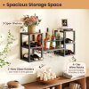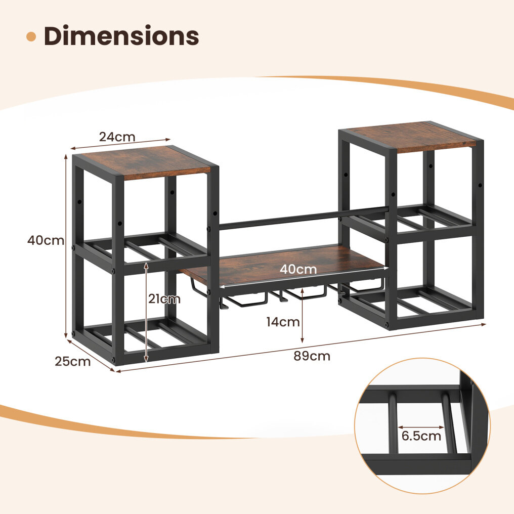 Featuring 8 wine racks for standard bottles, 3 rows of glass holders that hold 6-9 glasses, and 3 open shelves for additional storage, this rack ensures that all your wine essentials are elegantly presented. Crafted from durable metal tubing and a rust-resistant powder-coated finish, the rack offers a stable and reliable frame built to last. Experience the industrial, rustic style of this versatile rack, which can serve as a wine bar rack, display rack, or kitchen rack, offering endless possibilities for a clutter-free home environment.