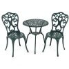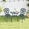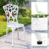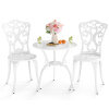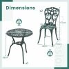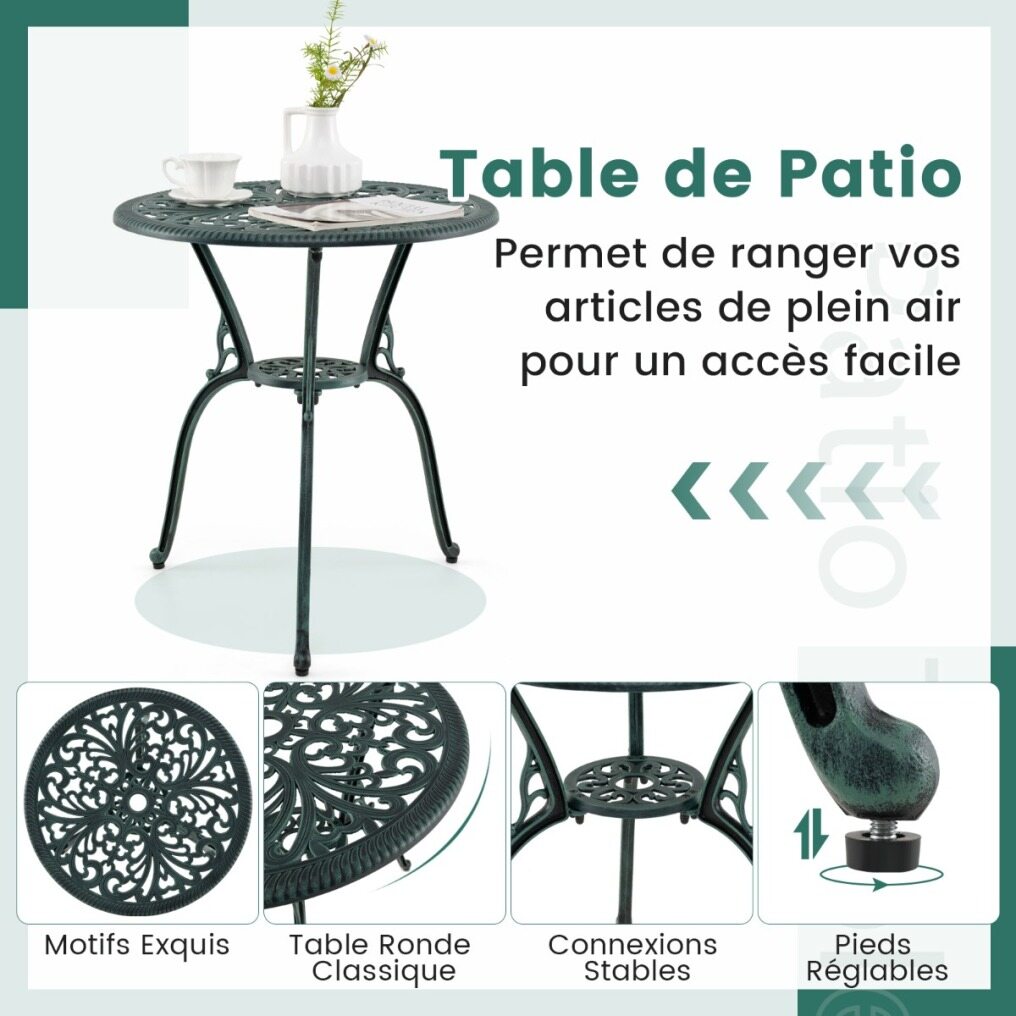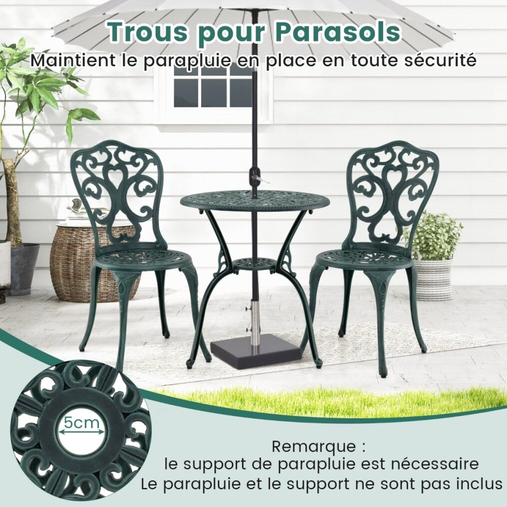 This garden furniture set, made of high-quality cast aluminum, guarantees long-lasting durability and minimal maintenance. Designed for a variety of outdoor activities, it includes a table that's ideal for placing drinks, books, or other items. On hot summer days, a parasol can be attached using the parasol hole. Each piece is designed for stability and features adjustable foot pads for uneven floors. The chairs also feature backrests and seats for added comfort. With their intricate patterns, the bistro table and chairs add a touch of elegance to the space—ideal for your patio, garden, or pool area.