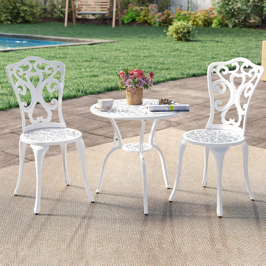 Elegant for a variety of spaces: This bistro set features intricate patterns, adding a touch of elegance to your space. Its versatile design integrates seamlessly with other furniture and makes a great addition to your patio, garden, or poolside decor.