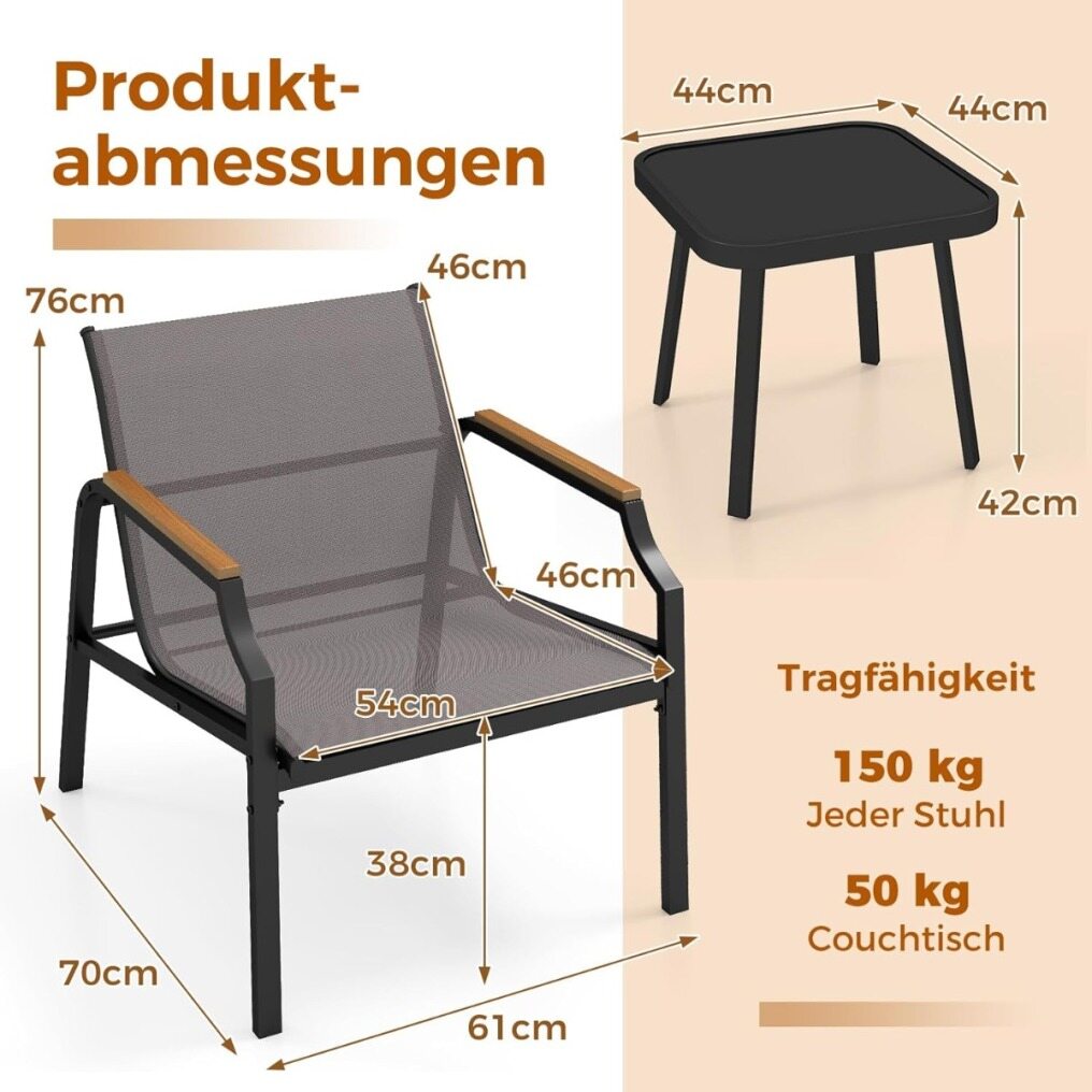 Fabulous Relaxing Option: Ideal for settings like balconies, porches, or gardens, this 3-piece chair set brings modern style and comfort, making it perfect for relaxation and conversation. Chair dimensions: 70 x 61 x 76 cm (L x W x H). Coffee table dimensions: 44 x 44 x 42 cm (L x W x H).