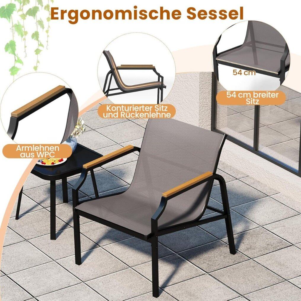 Ergonomic Armchairs: Each chair in the bistro set offers enhanced comfort with a 54 cm wide seat. The wood-plastic armrests and contoured seat and backrest provide an enhanced and comfortable experience.