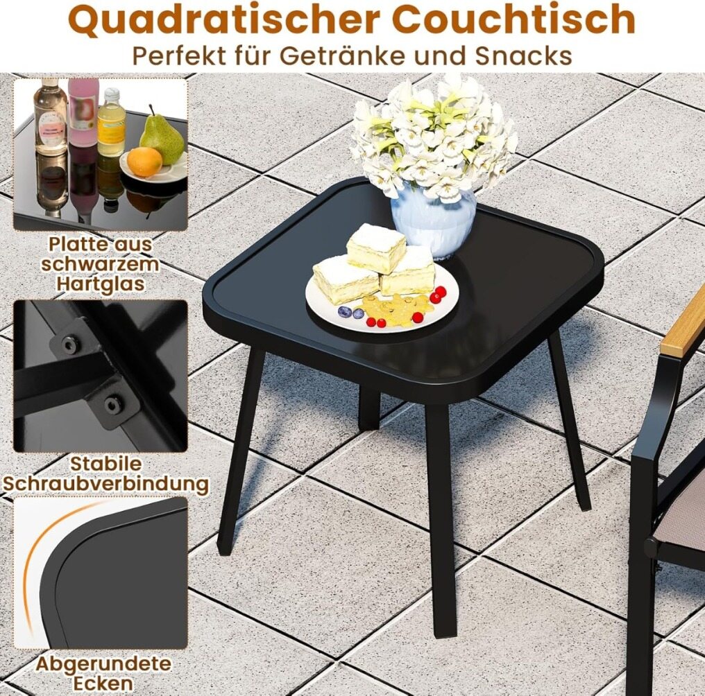Stylish side table: The chair set comes with an elegant square coffee table featuring a sleek black safety glass top that's both aesthetically pleasing and easy to clean. Rounded corners enhance safety in the modern design.