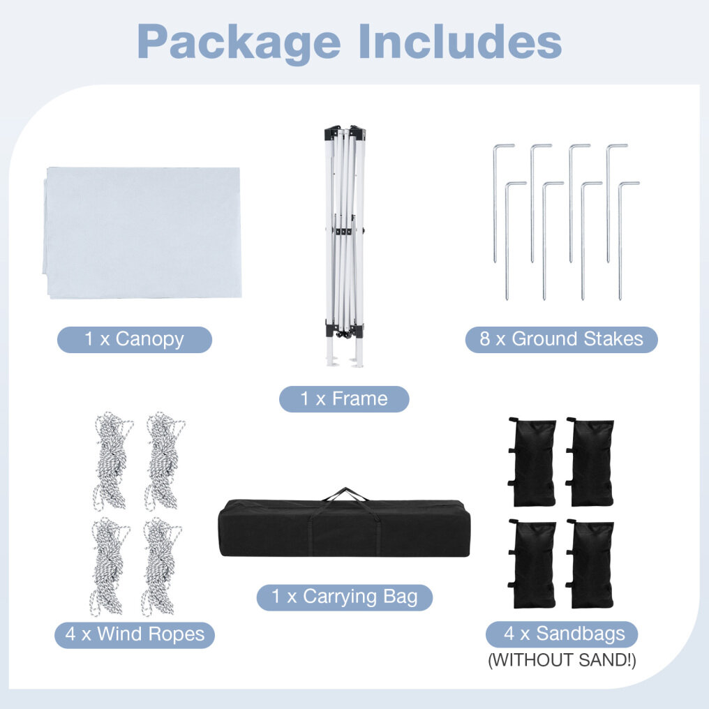 Stable and Reliable Construction: Designed with a heavy-duty carbon steel frame and reinforced truss connections, this pop up canopy tent offers excellent stability. Each corner is reinforced using 4 sandbags, 8 ground stakes, and 4 wind ropes, ensuring the canopy stays secure.