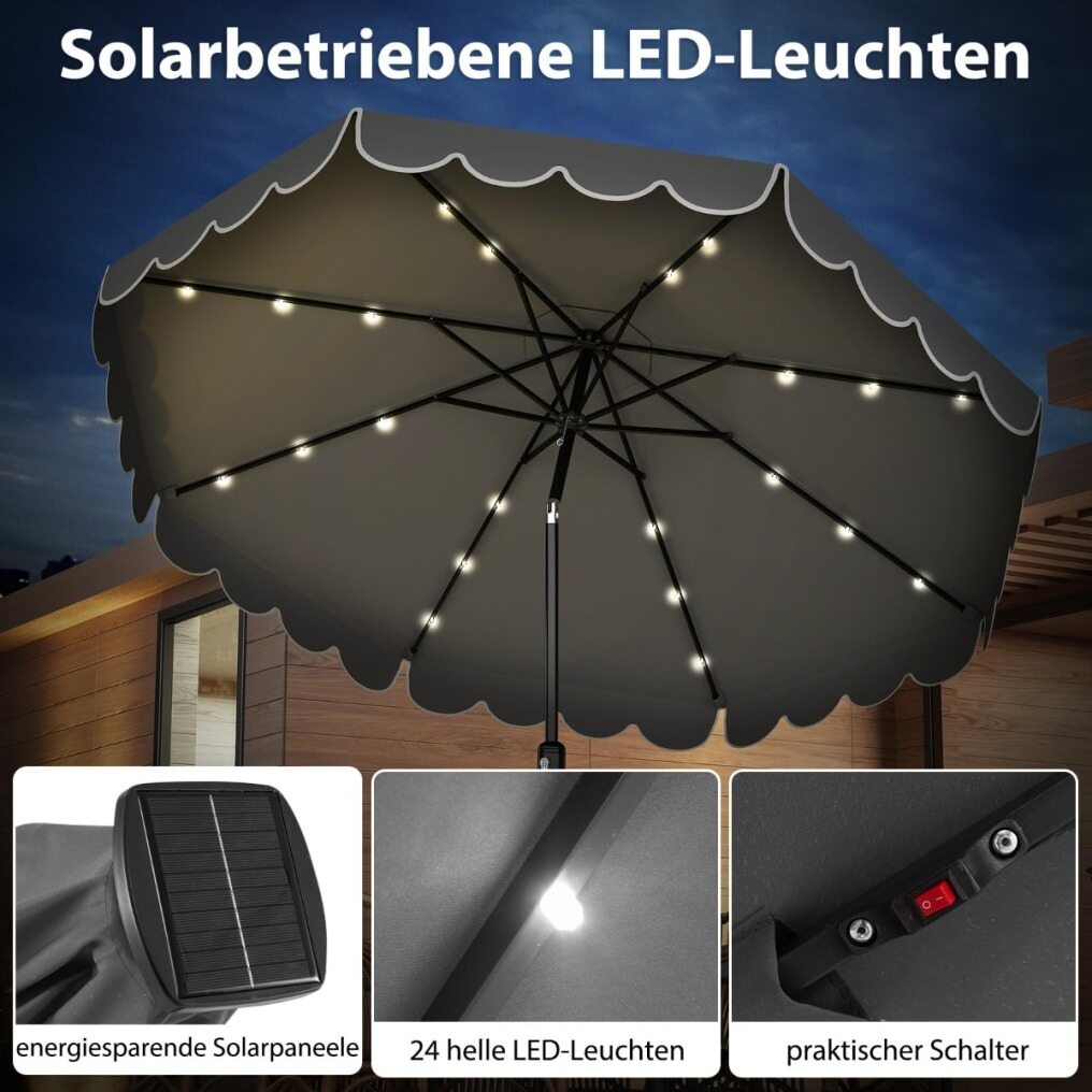 Solar-powered LED lights: This solar parasol is equipped with 24 bright, cool white LED lights along its ribs, creating a magical atmosphere after dark. The lights are powered by an energy-efficient solar panel.