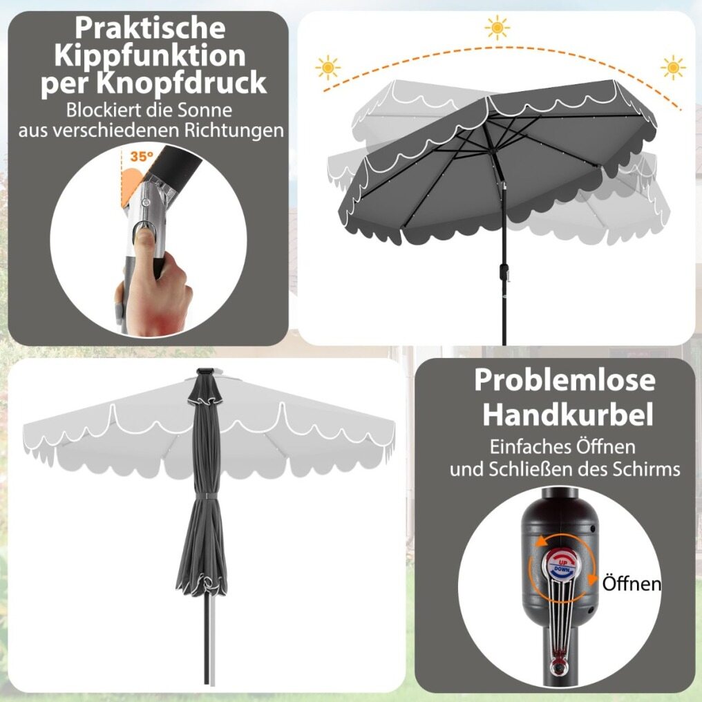 Automatically tilting design and crank operation: The convenient tilting function allows you to easily tilt the sunshade up to 35° in any direction at the touch of a button to achieve optimal shade. And the crank makes opening and closing the parasol effortless.